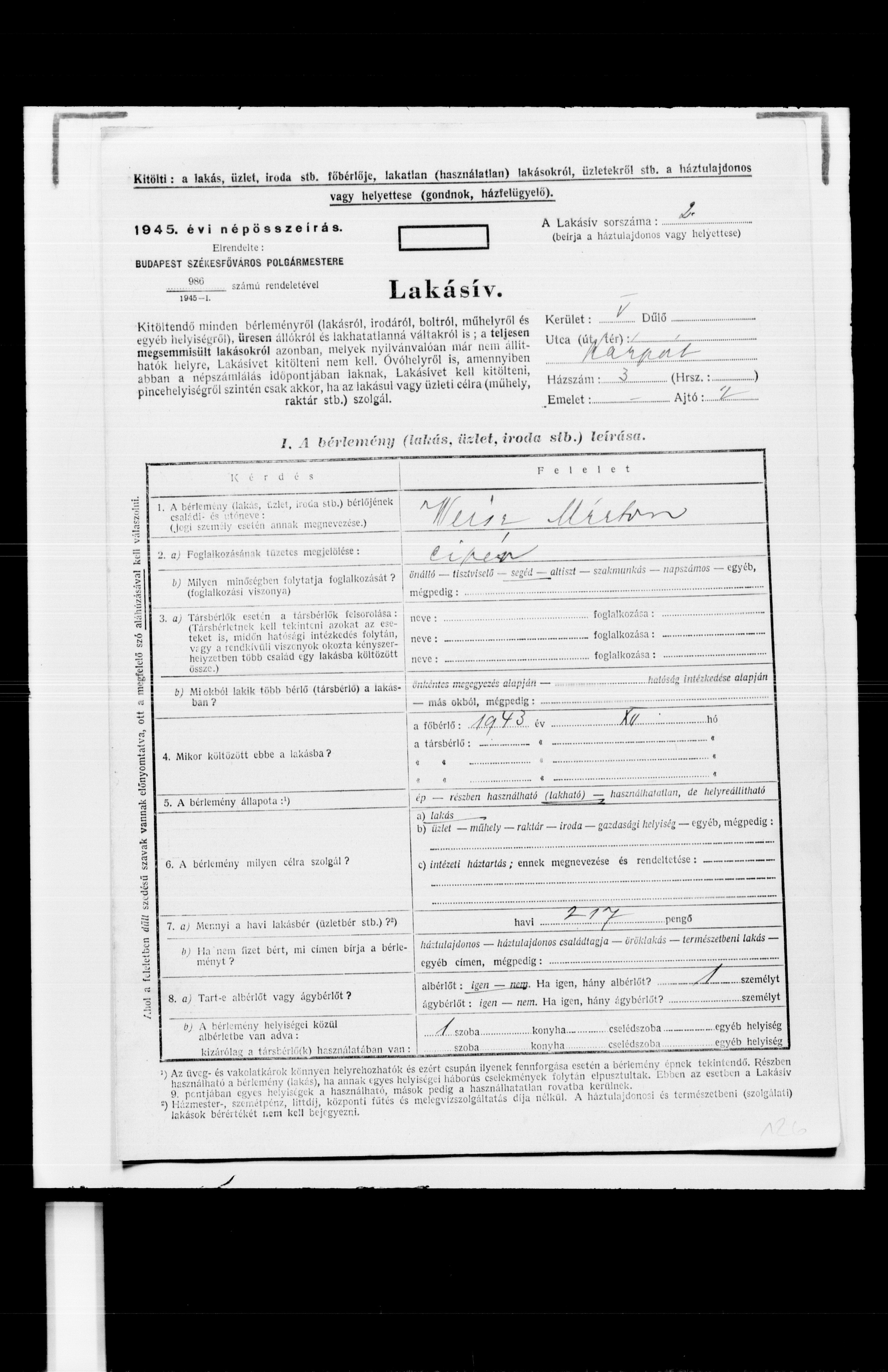 Questionnaire filled out by Weisz Márton, residing at Kárpát u. 3/2, Quarter V, in the context of the Population Census in Budapest, 1945