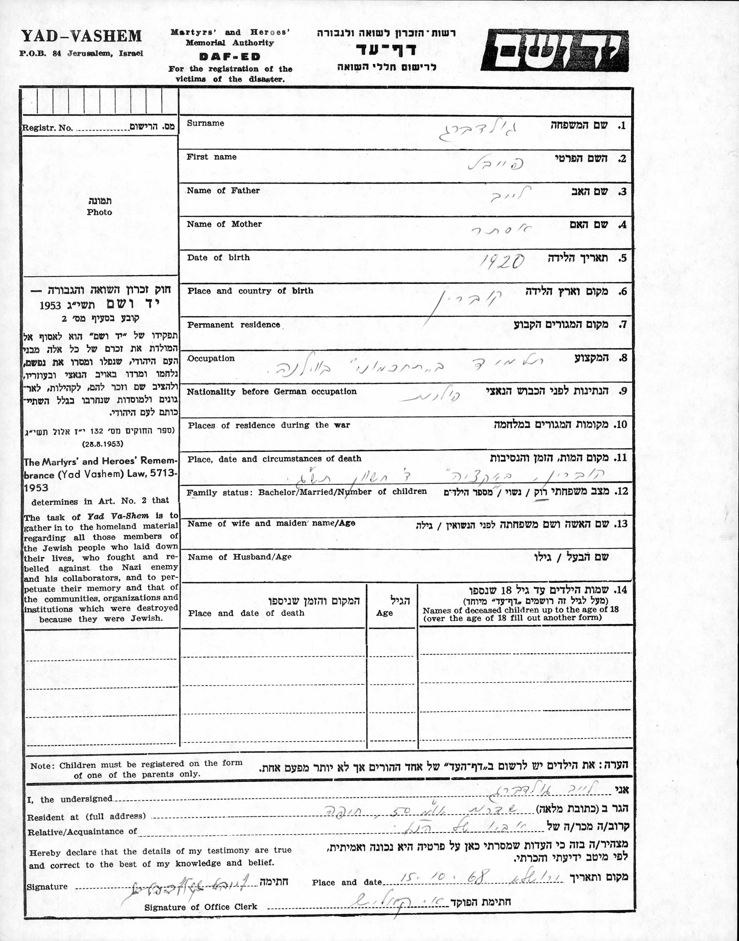 Яд Вашем - Листы свидетельских показаний Мемориального фонда