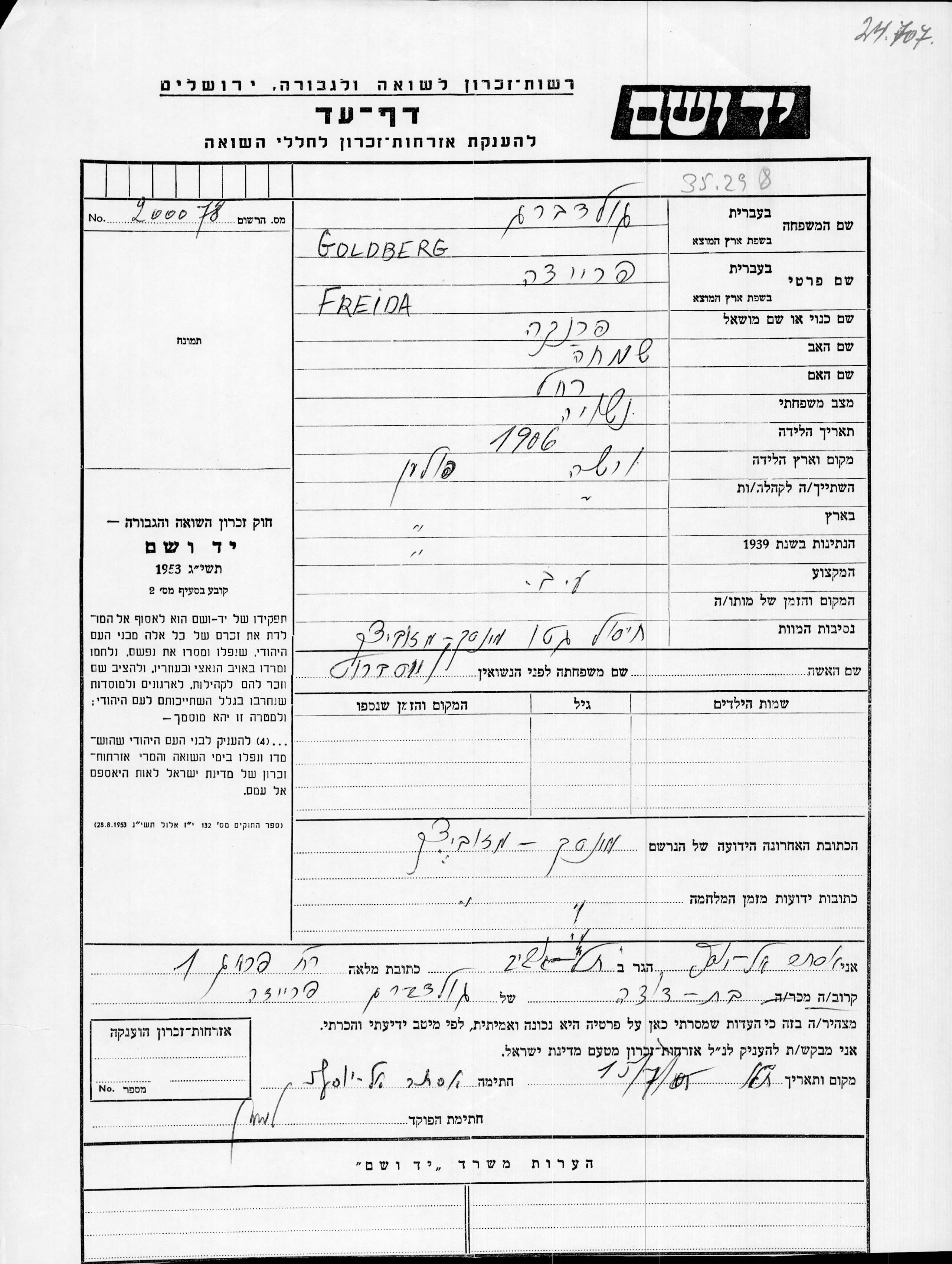 Фрейда Гольдберг, девичья фамилия Вейсброт, место рождения: Варшава, Польша. Отец: Симха, mать:Рахель. Женат / замужем. Место жительства до войны: Миньск-Мазовецки, Польша. Место во время войны: Миньск-Мазовецки, Польша.