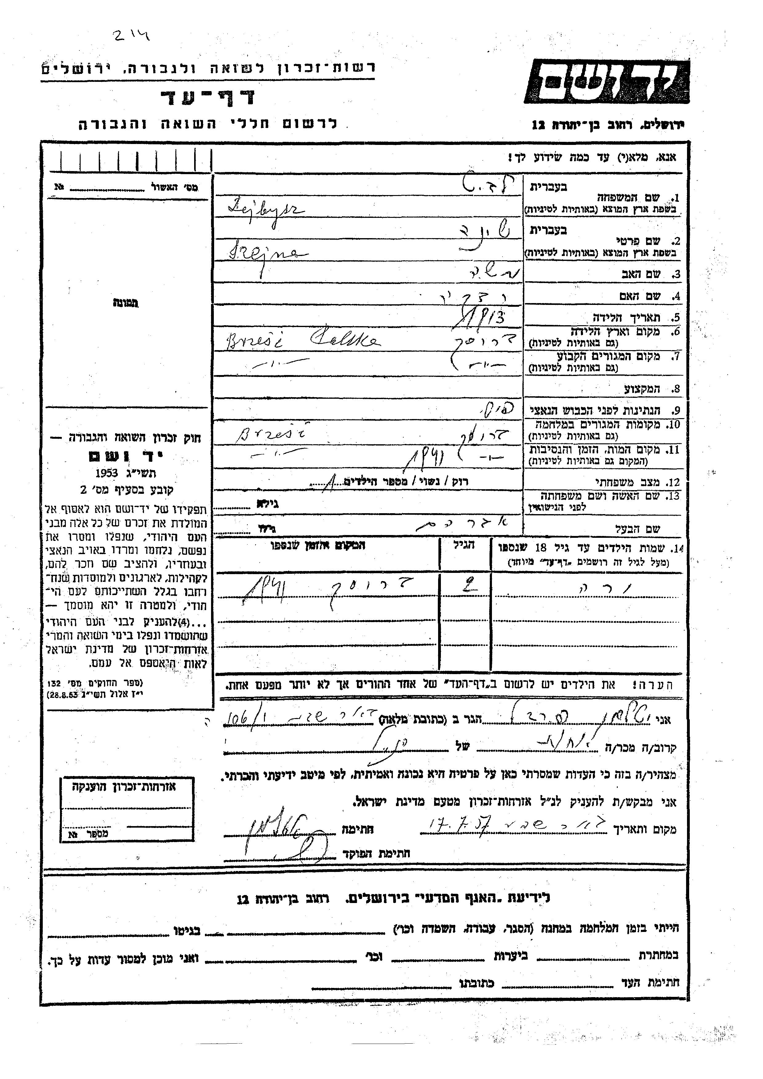 Шейна Лейбиш, место рождения: Брест Над Бугом, Польша. Отец: Моше, mать:Ривка. Женат / замужем. Место жительства до войны: Брест Над Бугом, Польша. Место во время войны: Брест Над Бугом, Польша.