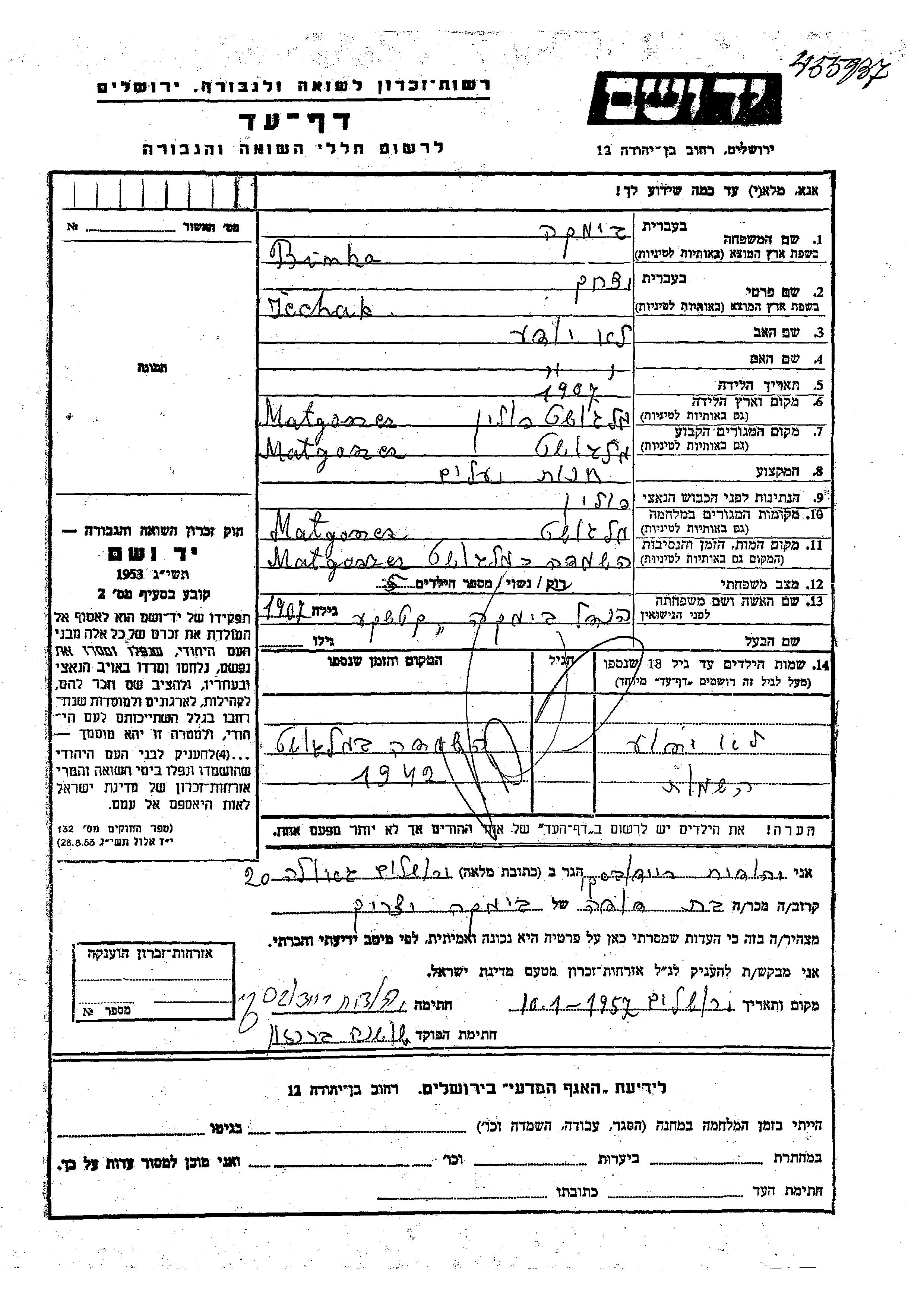 Бимка Ицхак 1907 Малогощ, Польша Лист свидетельских показаний