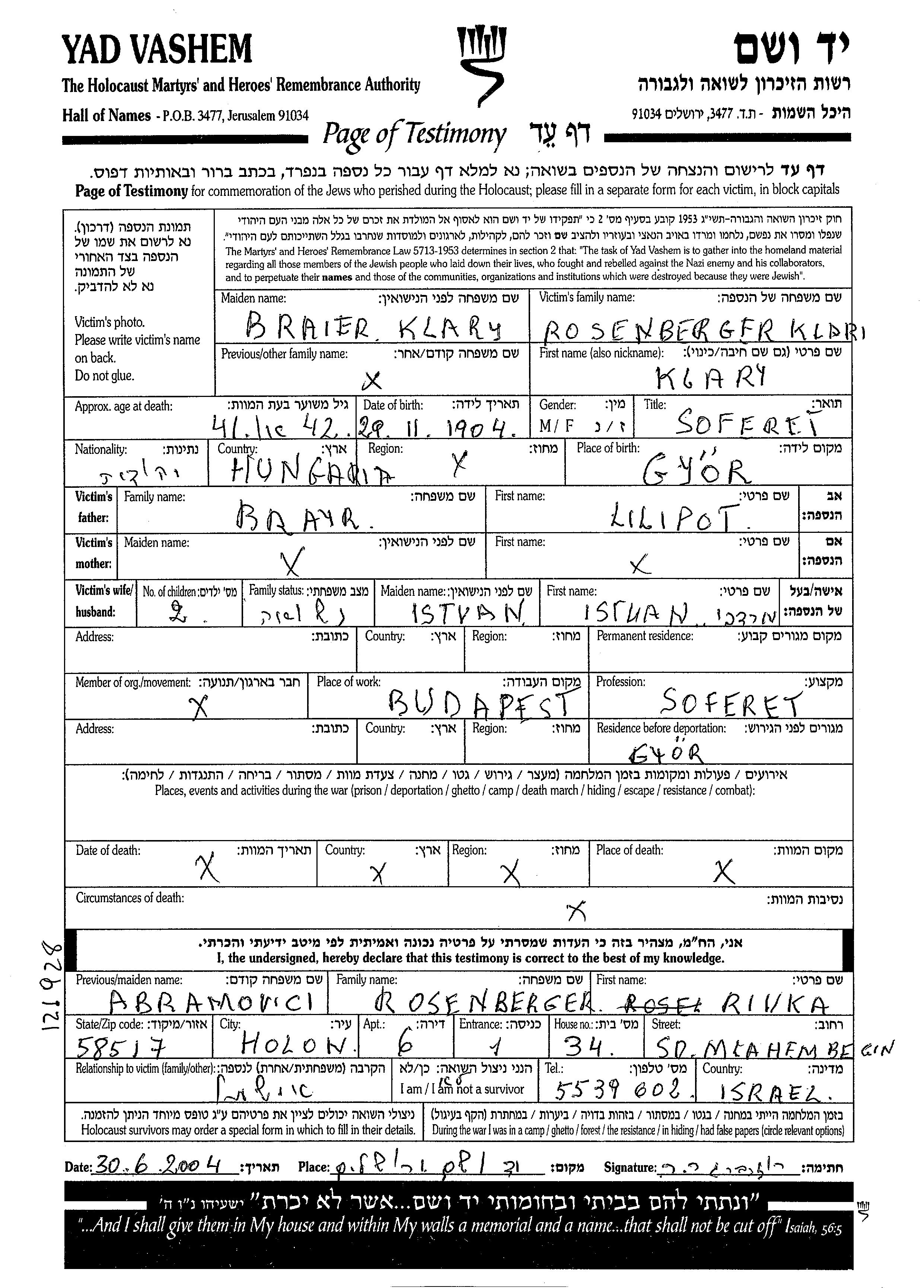 Клара Розенбергер, девичья фамилия Браер, место рождения: Дьёр, Венгрия. Писательница. Место жительства до войны: Дьёр, Венгрия.