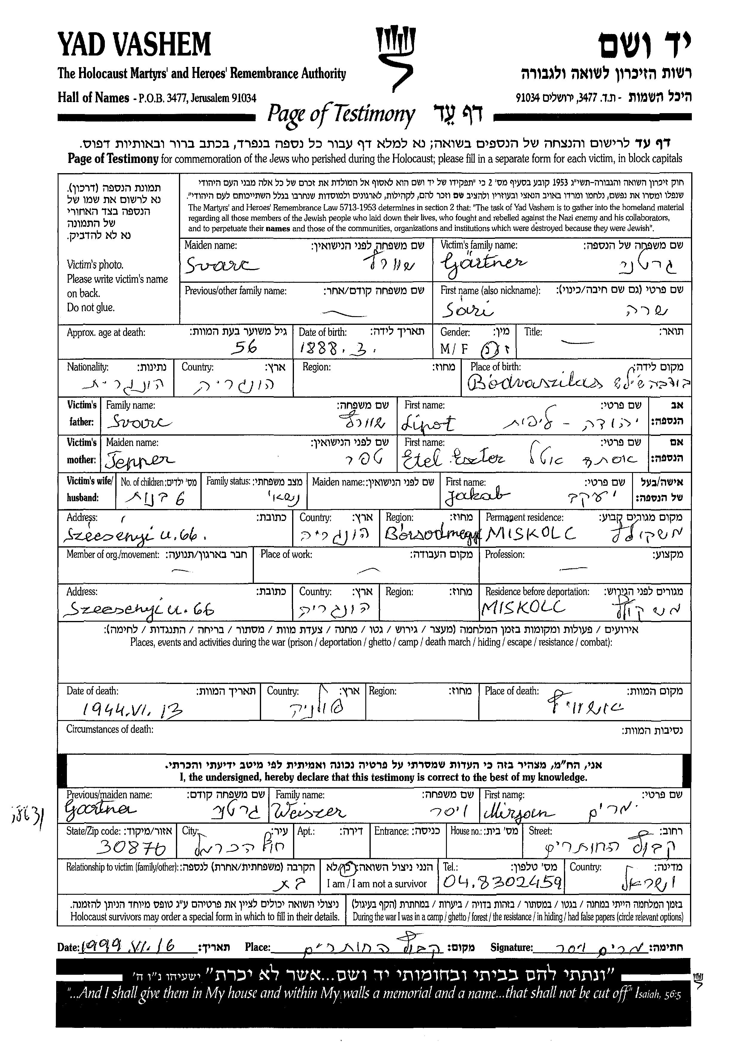 | Гертнер | Сара | 1890 | Мишкольц, Венгрия | Лист свидетельских показаний |