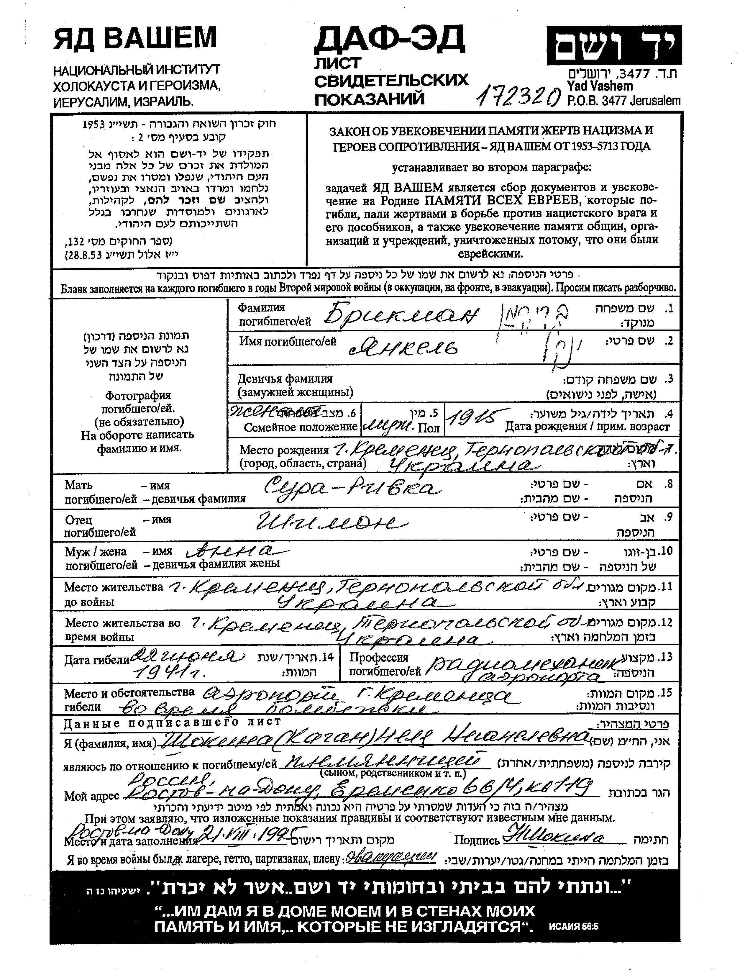 Брикман Янкель 1915 Кременец, Польша Лист свидетельских показаний