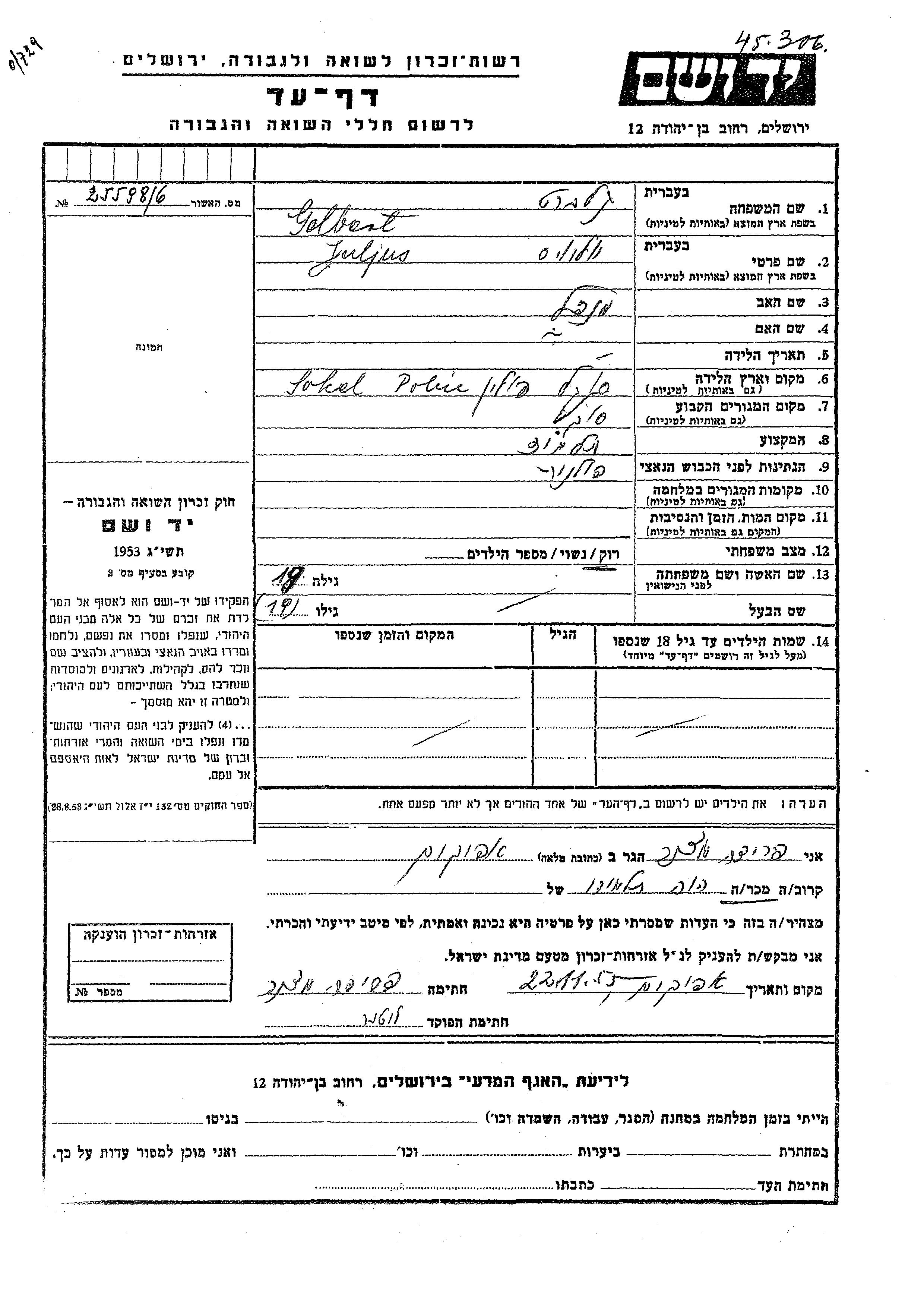 Юлиус Гельберт Гельбарт, место рождения: Сокаль, Польша. Отец: Мендель. Ученик / ученица. Место жительства до войны: Сокаль, Польша.
