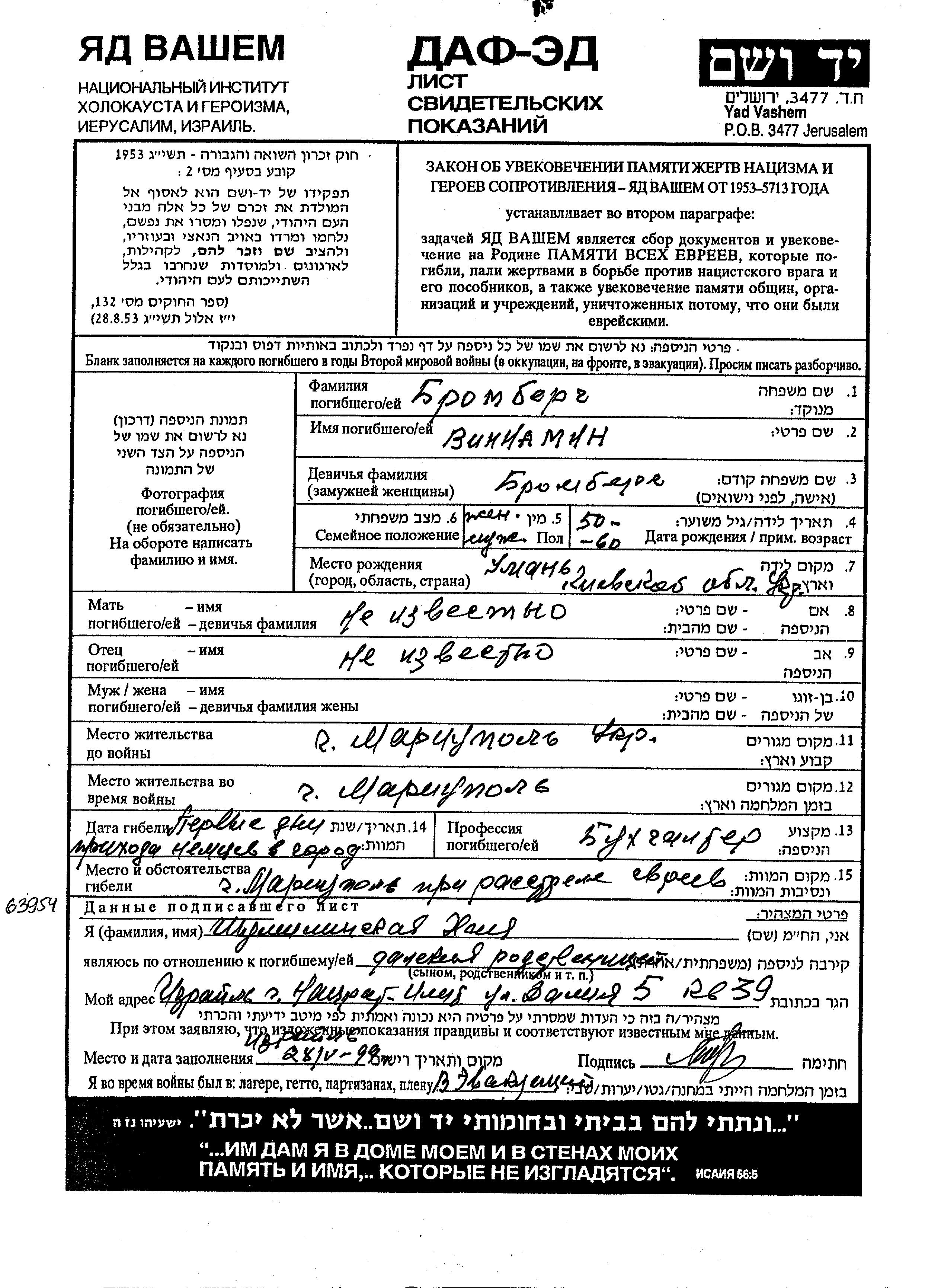Бромберг | Виниамин | Мариуполь, Украина (СССР) | Лист свидетельских показаний | |
