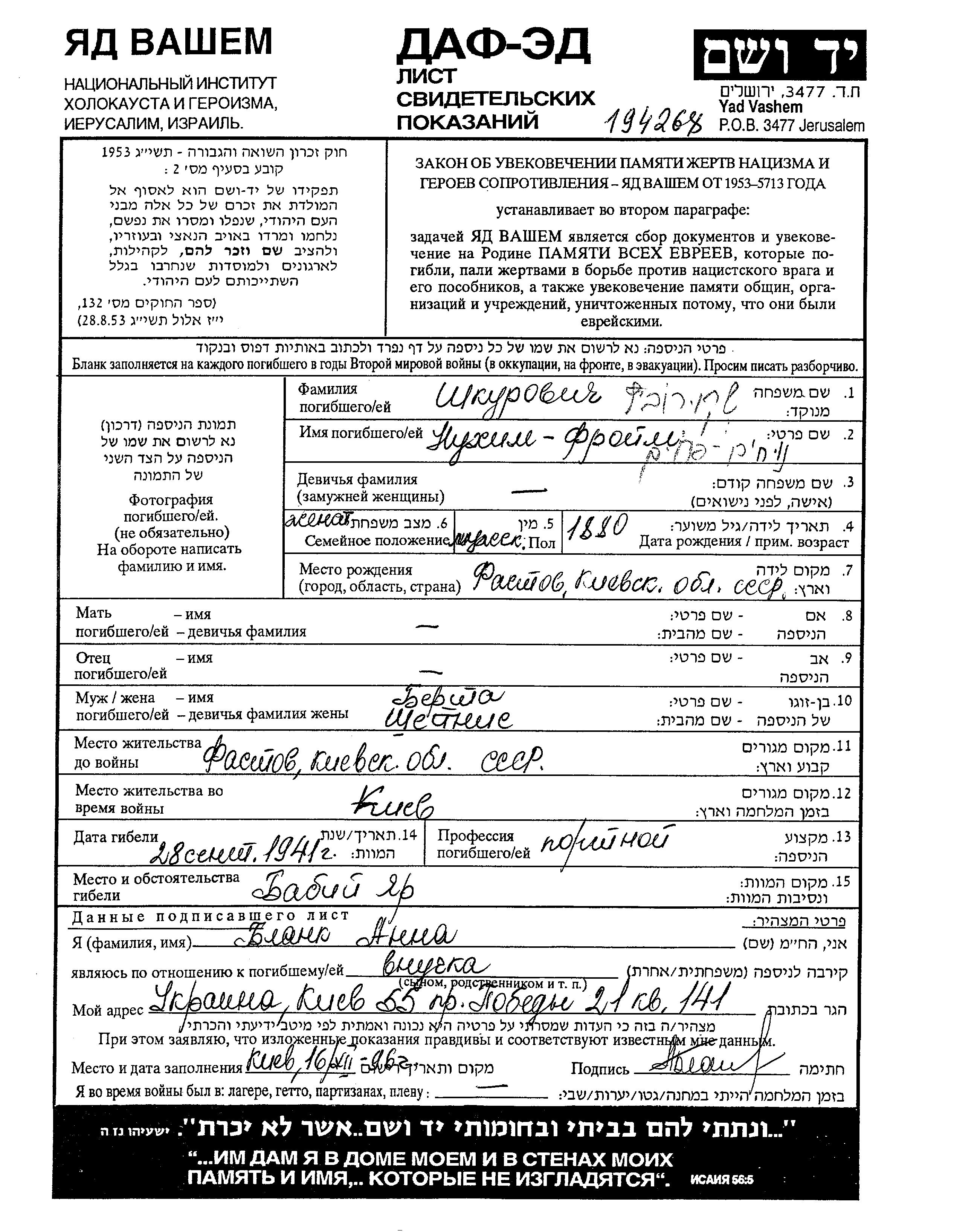 Нихим Фроим Шкурович, место рождения: Фастов, Украина (СССР). Портной / портниха. Женат / замужем. Место жительства до войны: Фастов, Украина (СССР). Место во время войны: Киев, Украина (СССР).