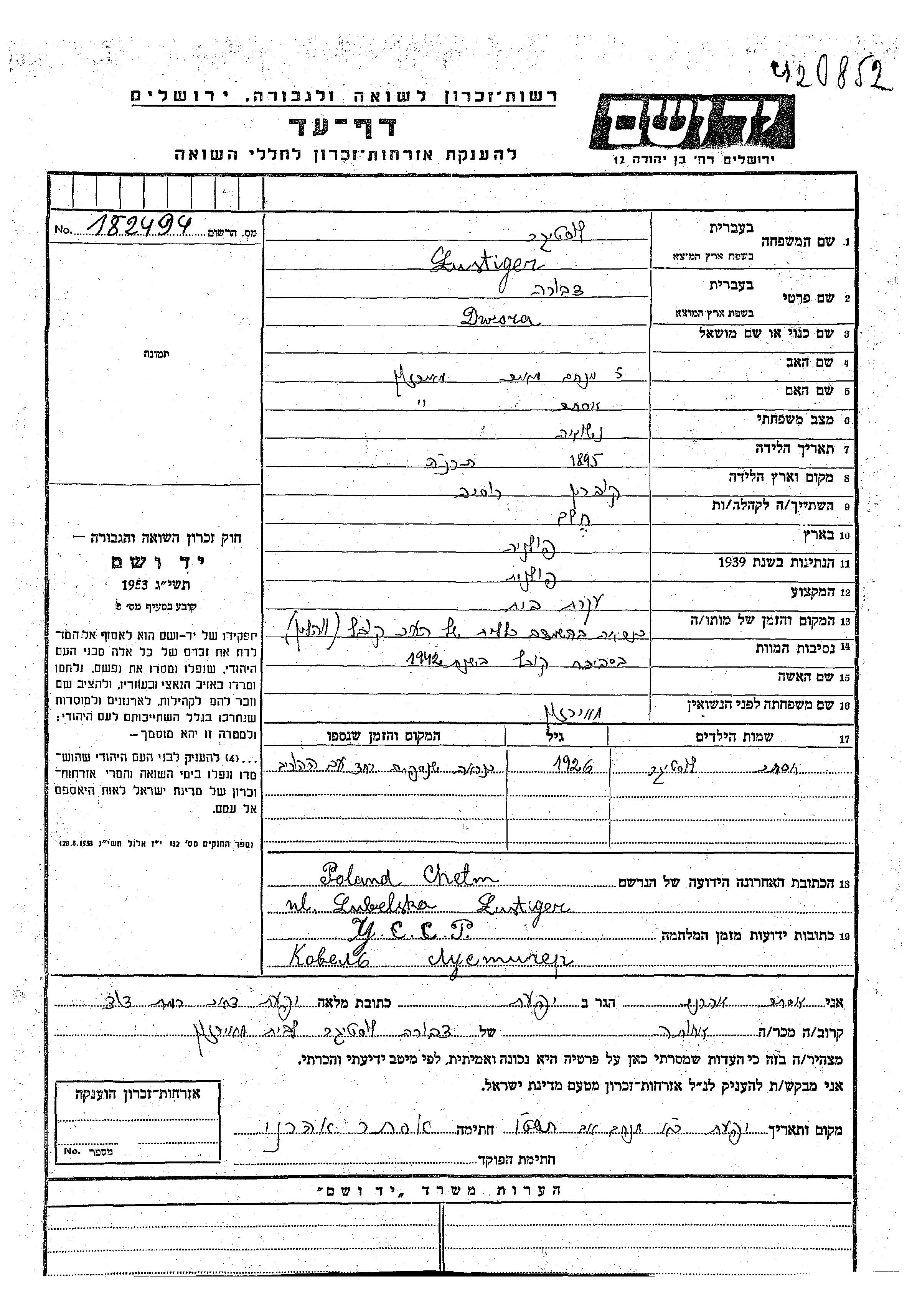 Двора Люстигер, девичья фамилия Меерзон, место рождения: Кобрынь, Польша. Отец: Менахем Меир, mать:Эстер. Домохозяйка. Женат / замужем. Место жительства до войны: Хелм, Польша. Место во время войны: Хелм, Польша.