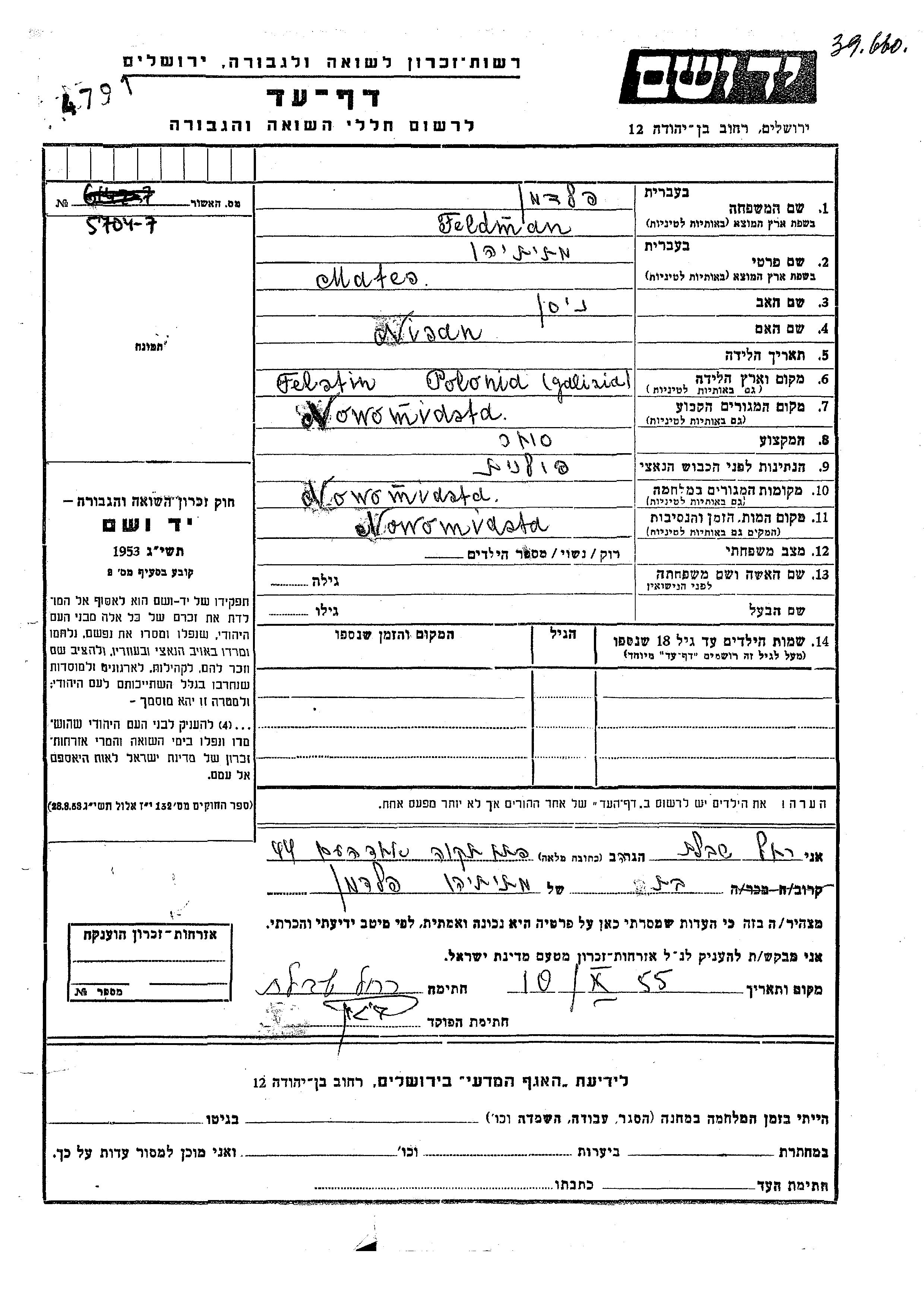 Матес Матитьягу Фельдман, место рождения: Фельштын, Польша. Отец: Нисан. Торговец / торговка. Место жительства до войны: Нове-Място, Польша. Место во время войны: Нове-Място, Польша.