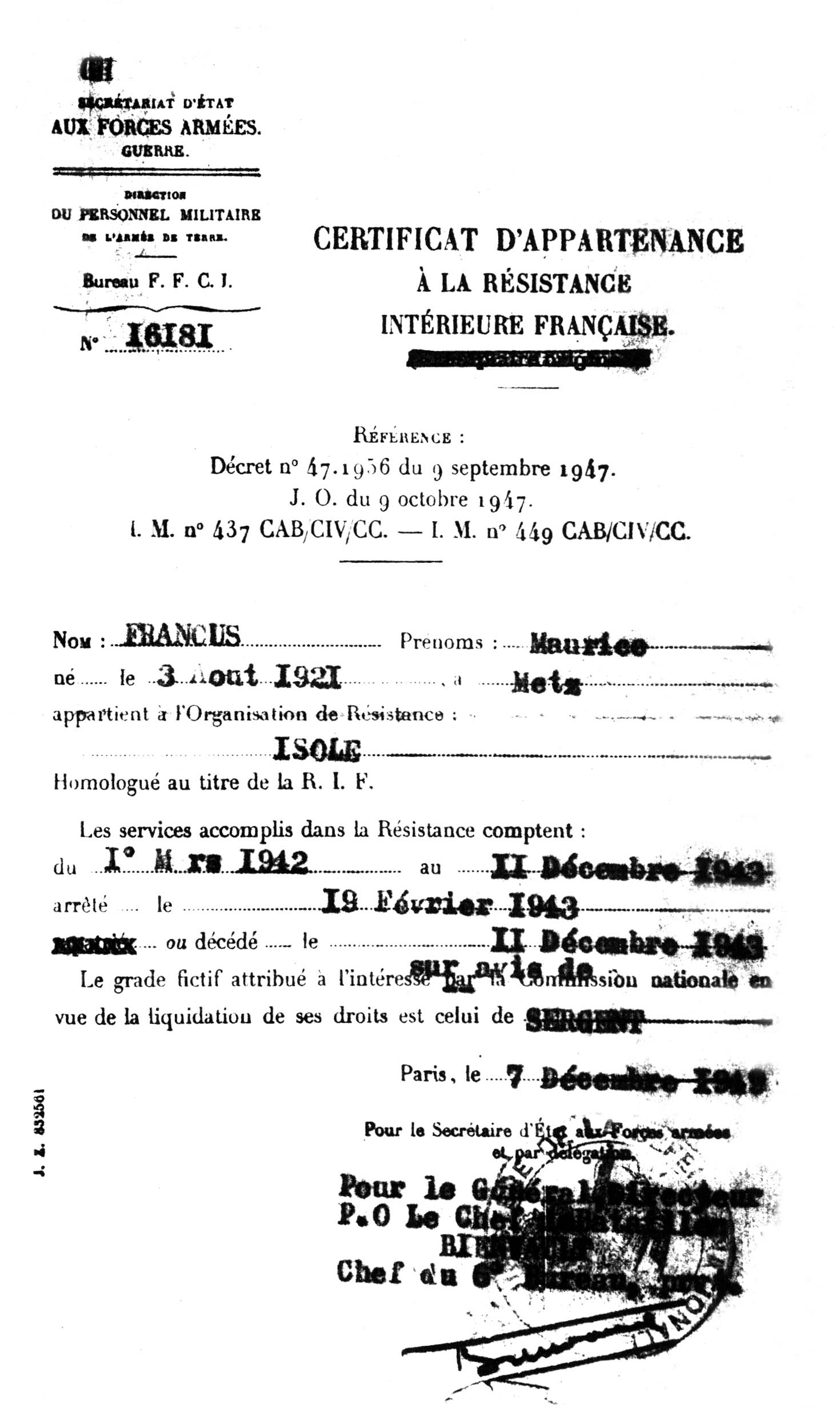 Мориц Моше Францус, место рождения: Мец, Франция. Отец: Абраам, mать:Фелицие Фейге. Место жительства до войны: Мец, Франция. Место во время войны: Мец, Франция.
