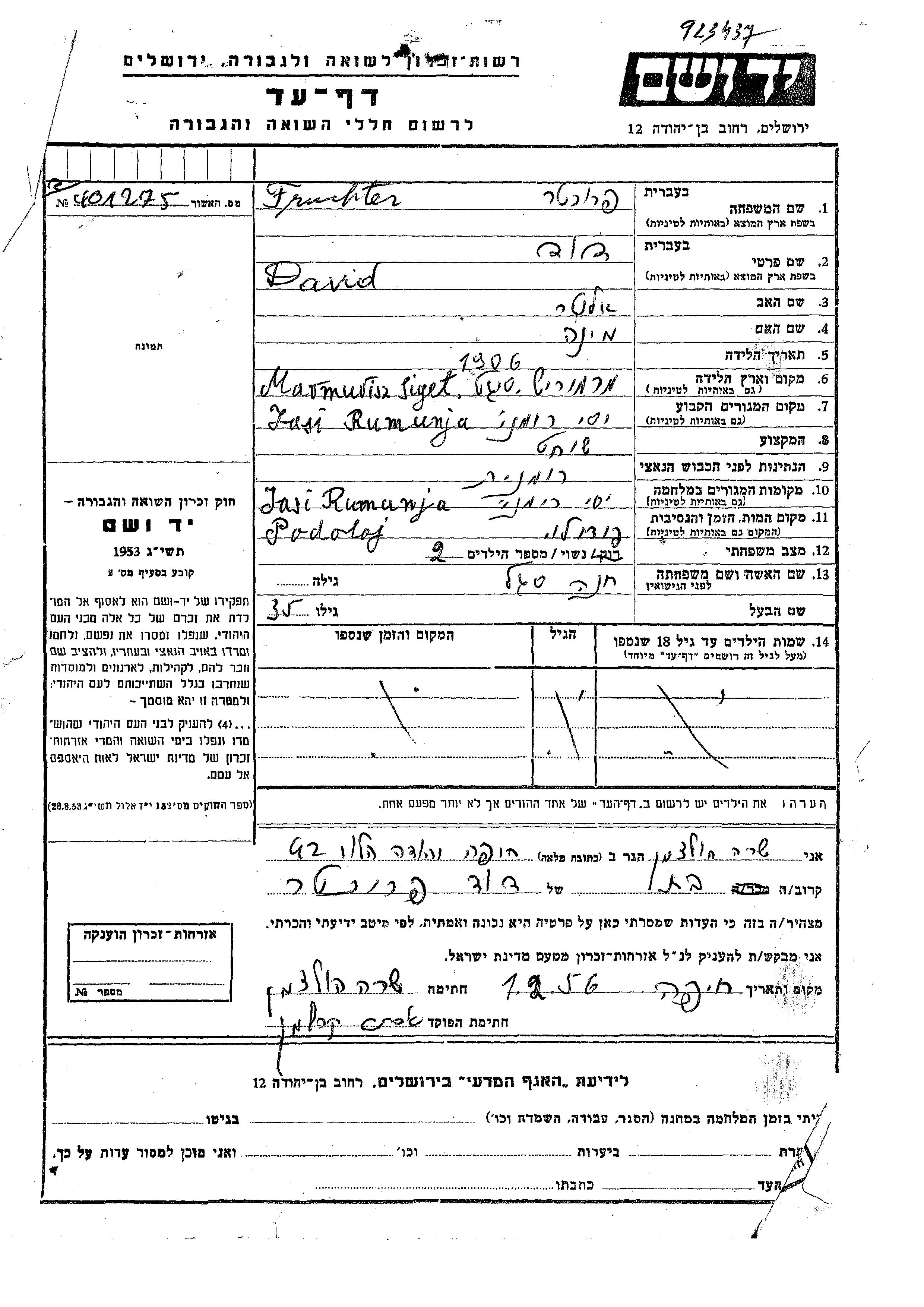 Фрухтер Давид 1906 Яссы, Румыния Лист свидетельских показаний