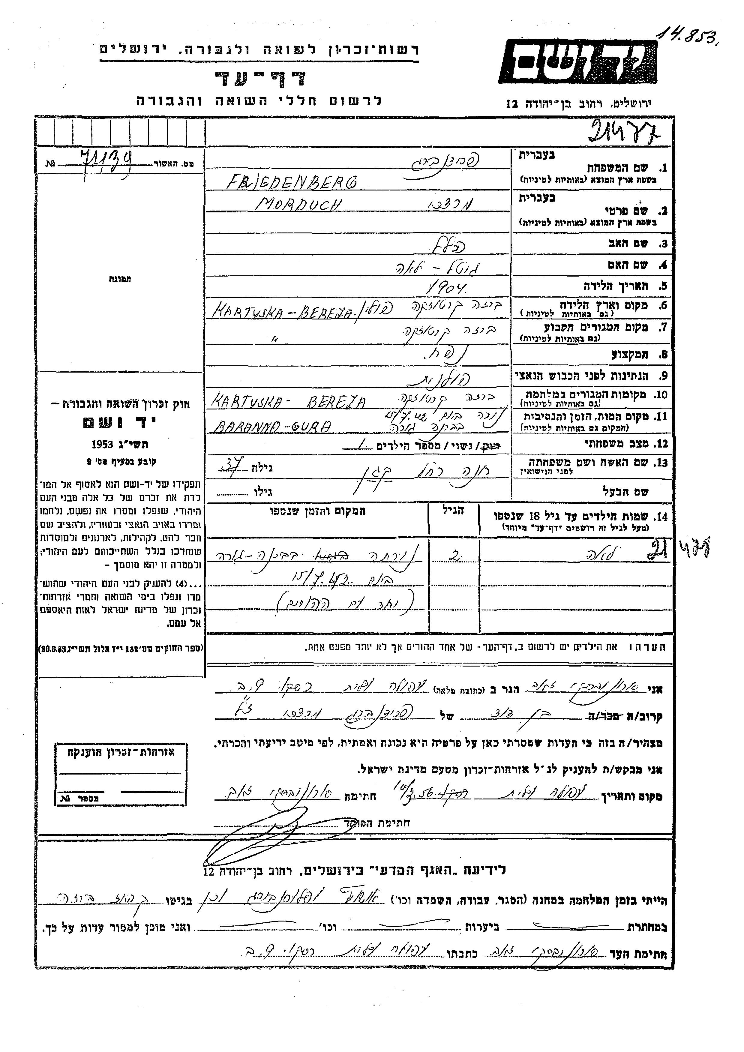Мордух Фриденберг, место рождения: Береза Картуская, Польша. Отец: Хилель, mать:Гитель Лея. Кузнец. Женат / замужем. Место жительства до войны: Береза Картуская, Польша. Место во время войны: Береза Картуская, Польша.