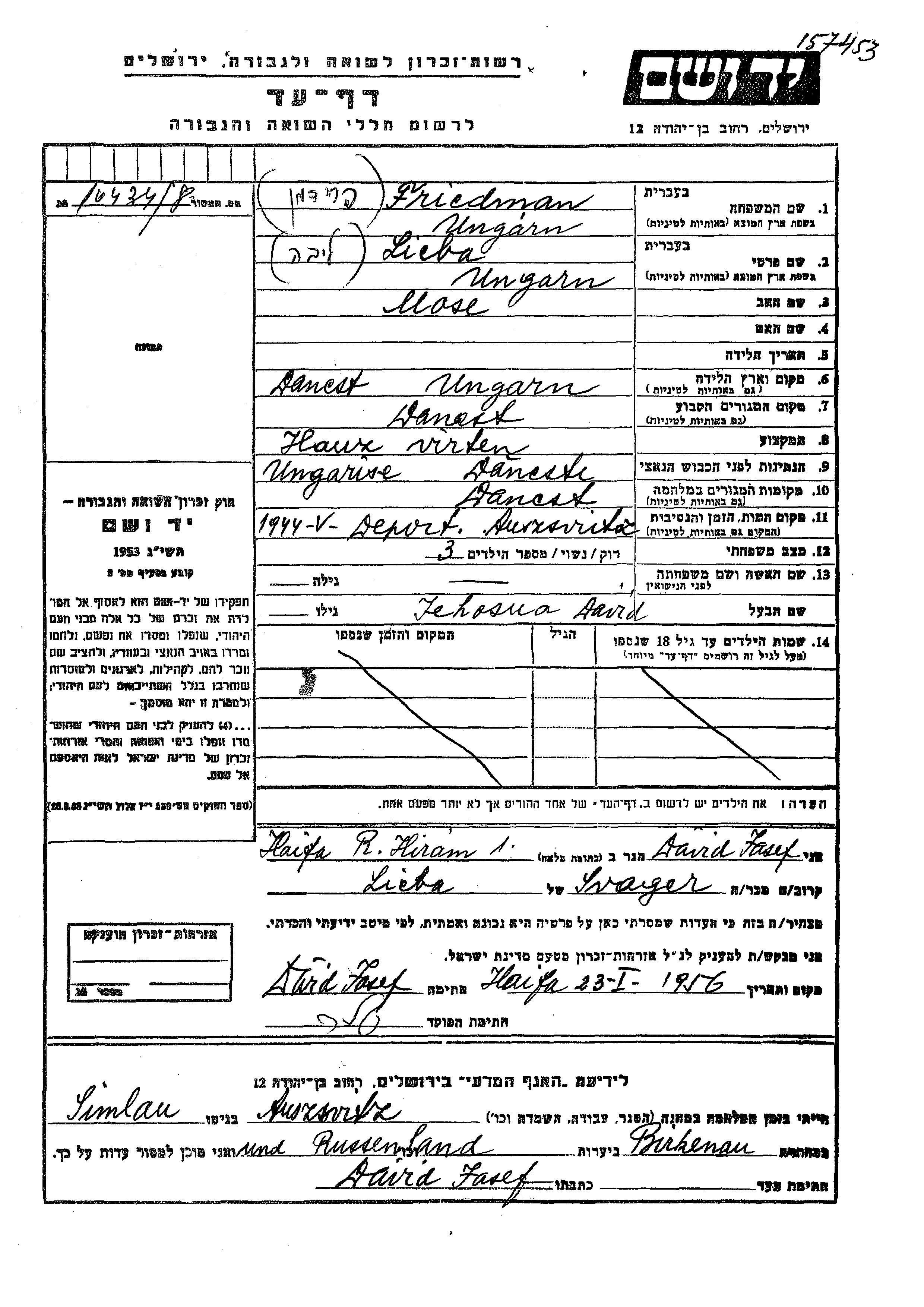 Либа Фридман, место рождения: Дэнешть, Румыния. Отец: Моше. Домохозяйка. Женат / замужем. Место жительства до войны: Дэнешть, Румыния. Место во время войны: Дэнешть, Румыния.