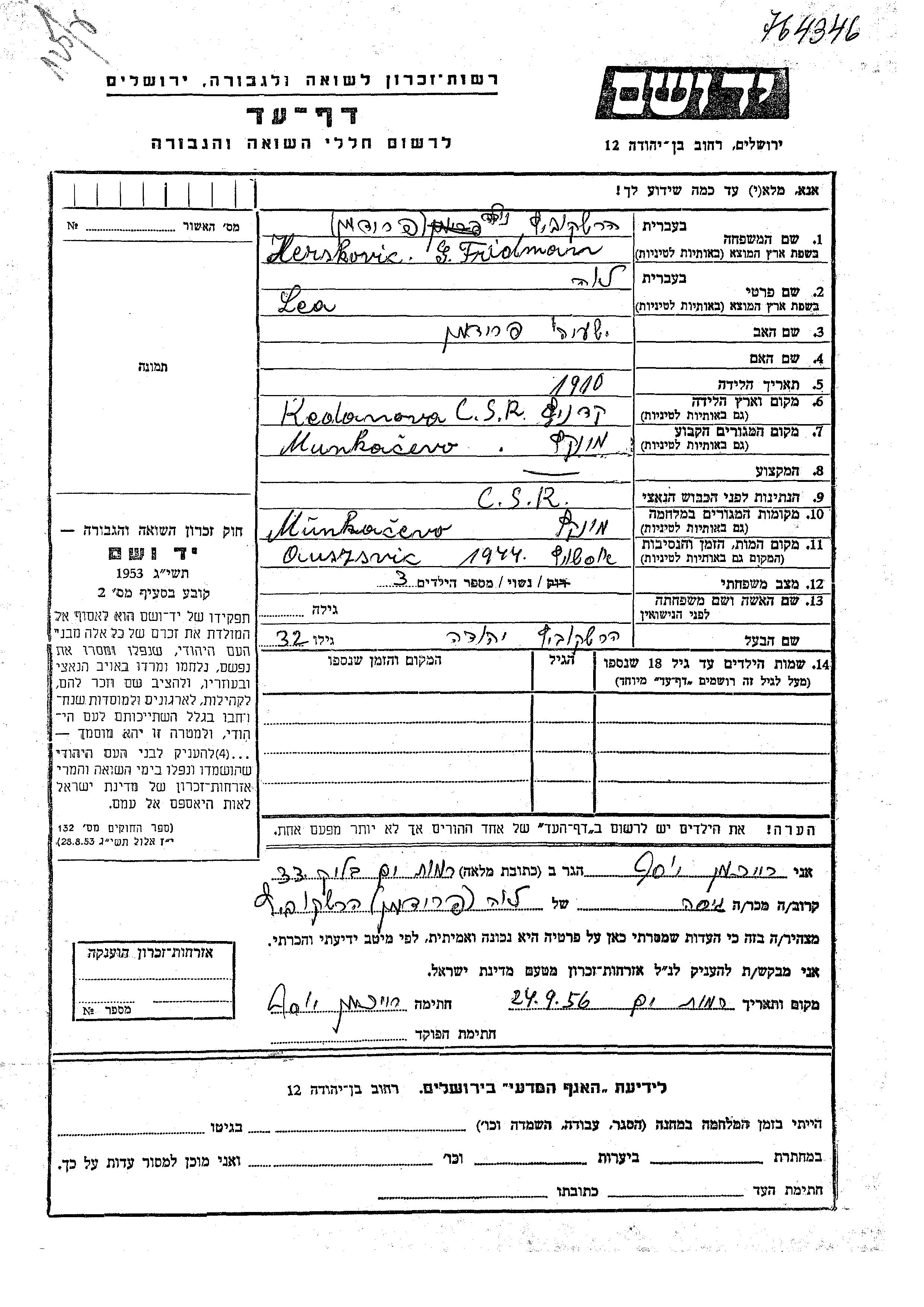Хершковиц Лея 1910 Мункачево, Чехословакия Лист свидетельских показаний