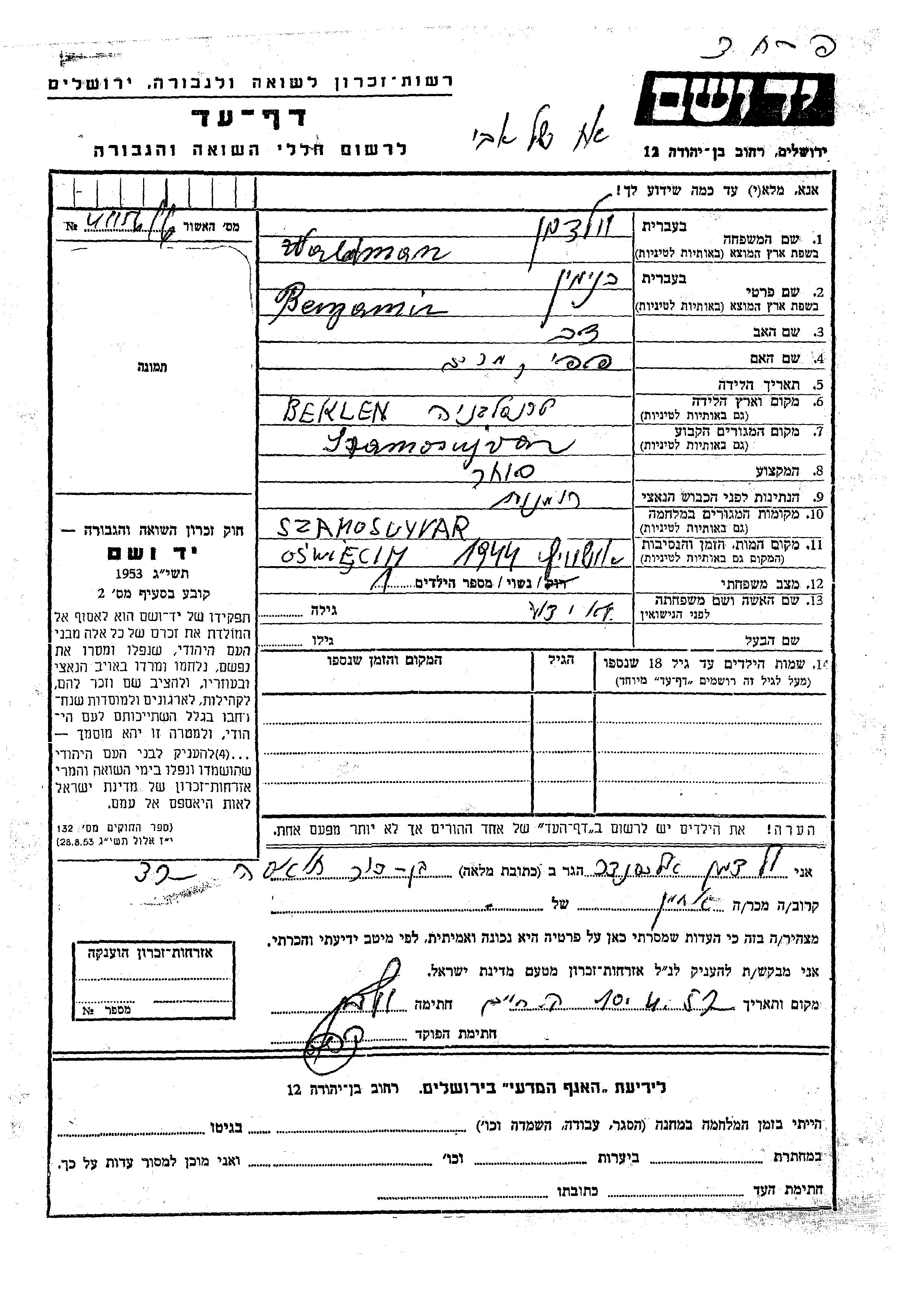 Беньямин Вальдман, место рождения: Беклян, Румыния. Отец: Дов, mать:Пепи Мирьям. Торговец / торговка. Женат / замужем. Место жительства до войны: Самошуйвар, Румыния. Место во время войны: Самошуйвар, Румыния.
