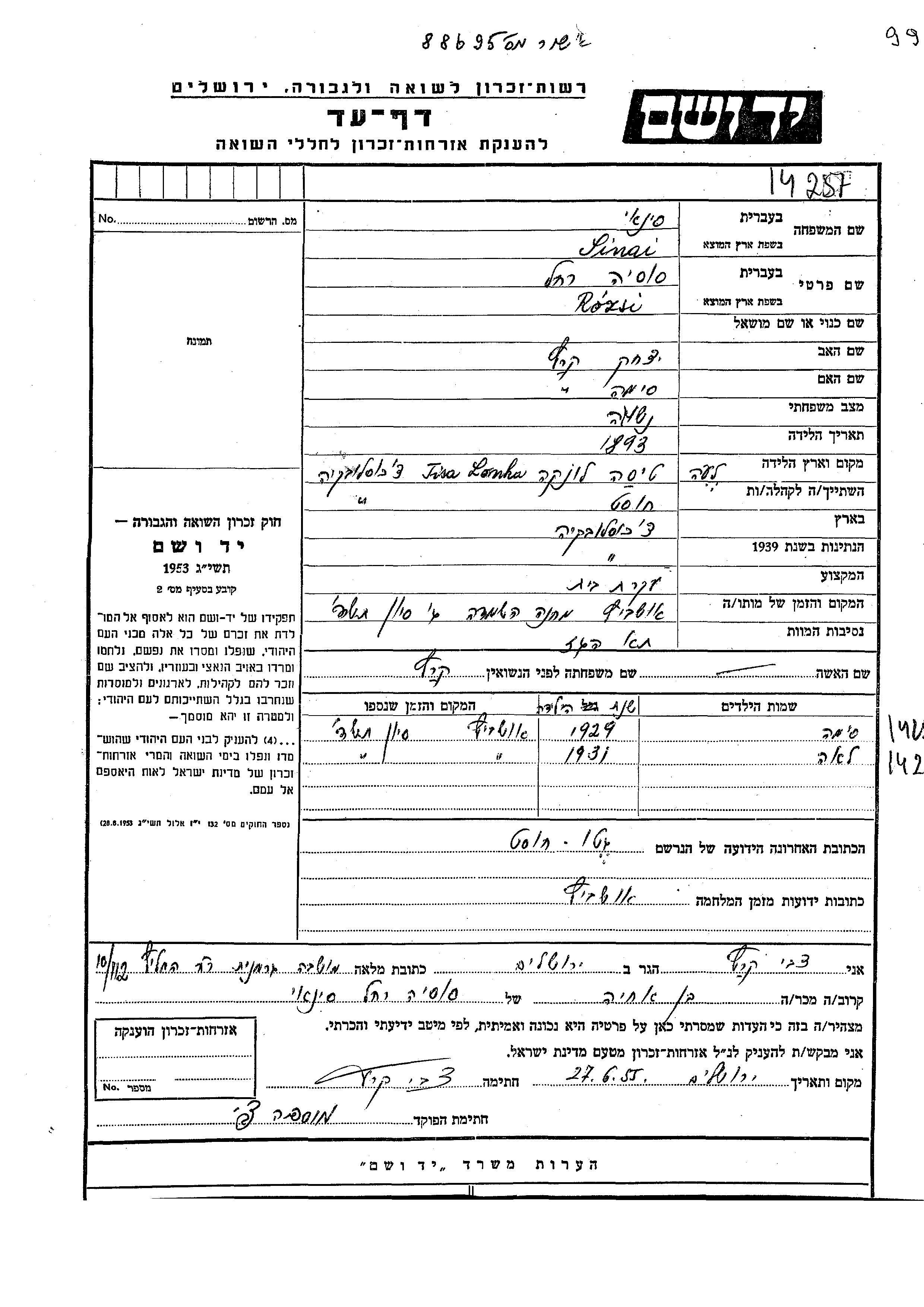 Синай Рожи Сосия Рахель 1893 Хуст, Чехословакия Лист свидетельских показаний