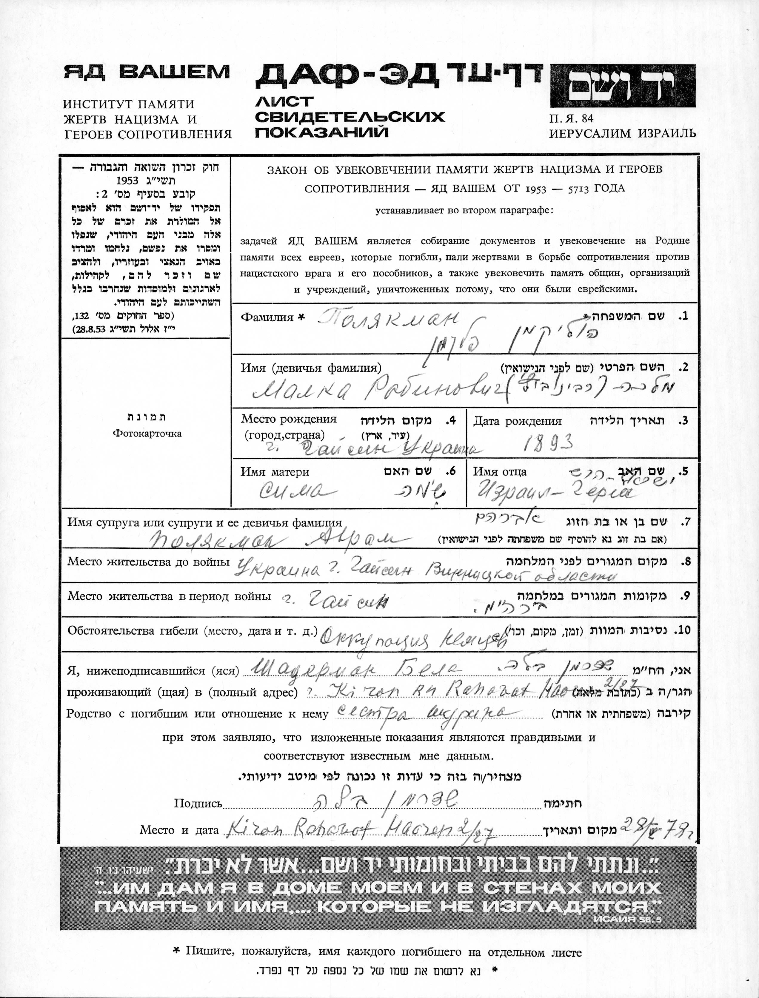 Малка Полякман Поликман Флекман, девичья фамилия Рабинович, место рождения: Гайсин, Украина (СССР). Отец: Израиль Герш, mать:Сима Шима. Место жительства до войны: Гайсин, Украина (СССР). Место во время войны: Гайсин, Украина (СССР).
