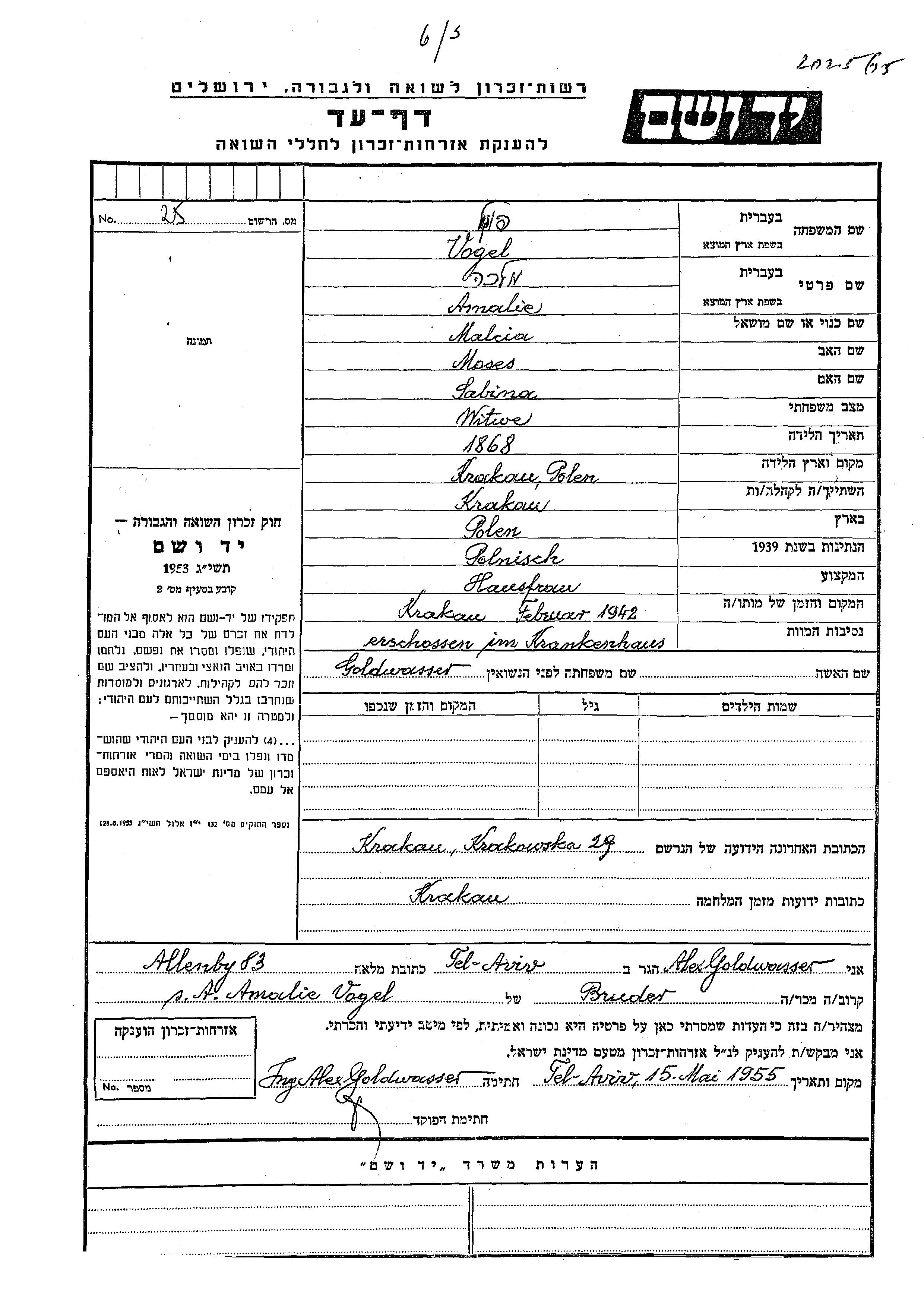 Амали Малця Фогель, девичья фамилия Гольдвассер, место рождения: Краков, Польша. Отец: Мозес, mать:Сабина. Домохозяйка. Вдова. Место жительства до войны: Польша. Место во время войны: Краков, Польша.