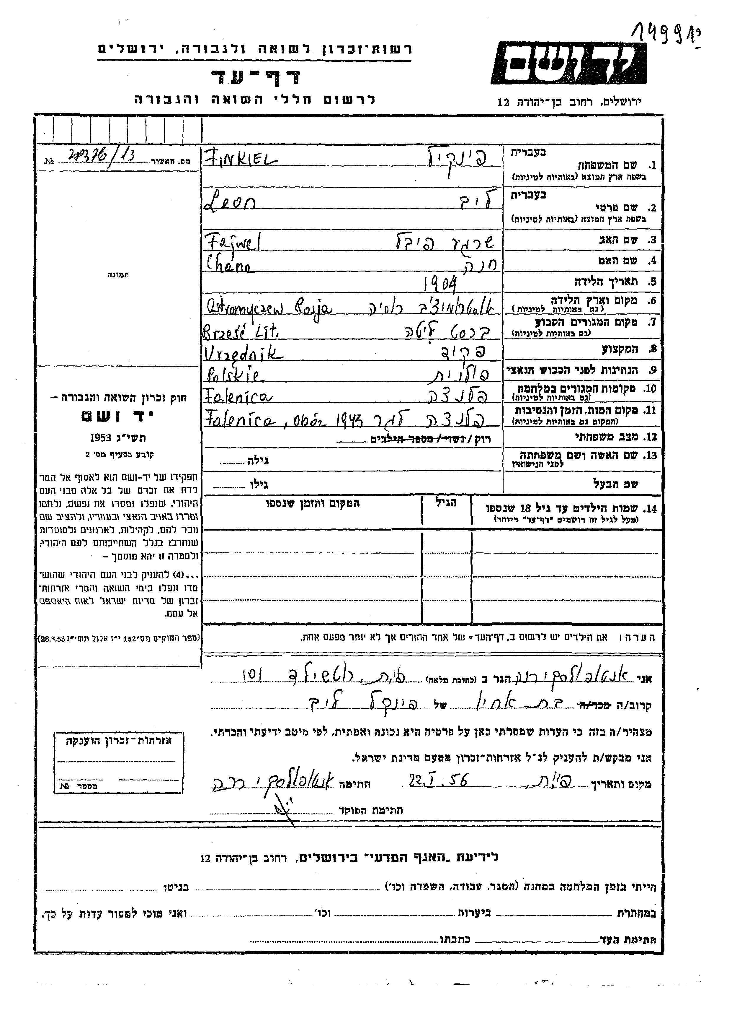 Лейб Леон Финкель, место рождения: Остромечево, Польша. Отец: Файвел Шраге, mать:Хана. Клерк. Холост / не замужем. Место жительства до войны: Брест Над Бугом, Польша. Место во время войны: Фаленица, Польша.