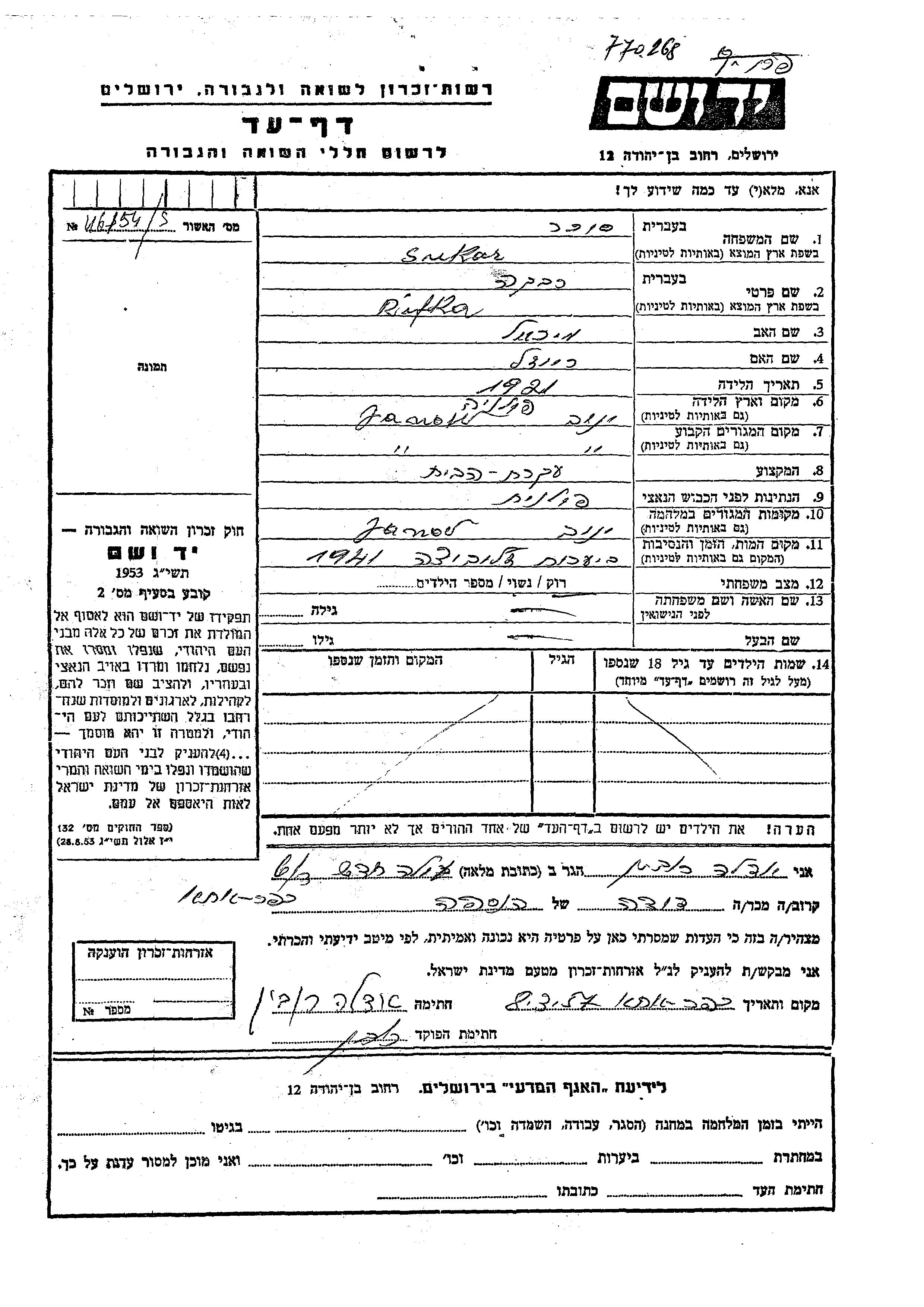 Сукар Рифка 1921 Янув, Польша Лист свидетельских показаний