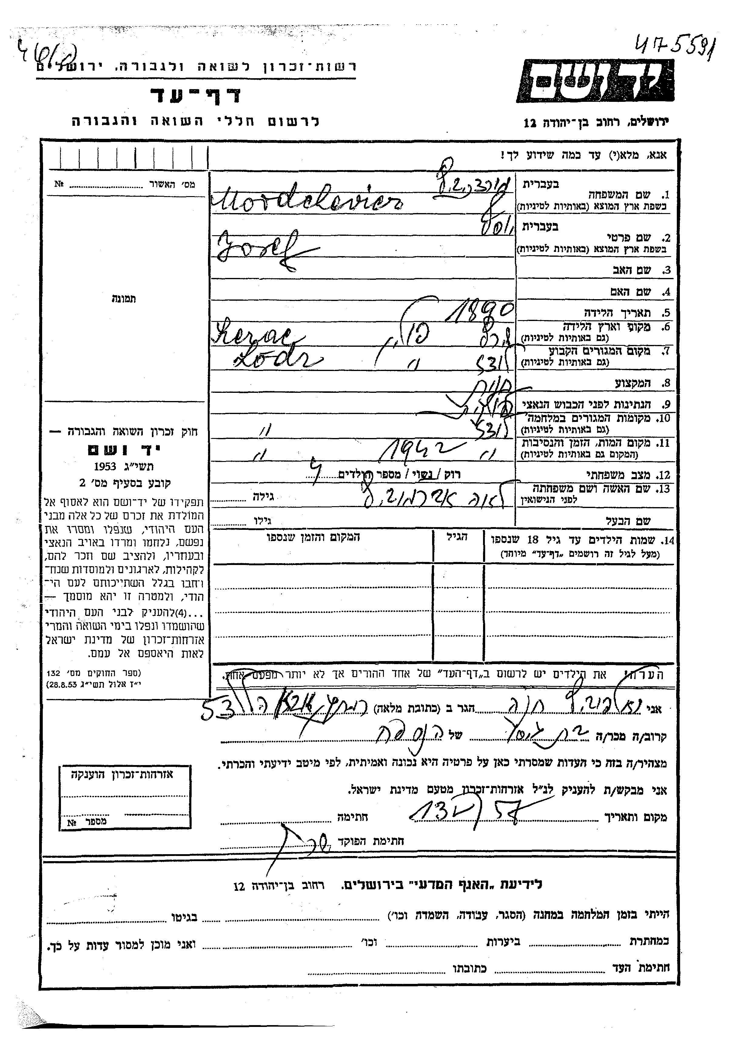 Иосеф Мордхович, место рождения: Шерац, Польша. Женат / замужем. Место жительства до войны: Лодзь, Польша. Место во время войны: Лодзь, Польша.