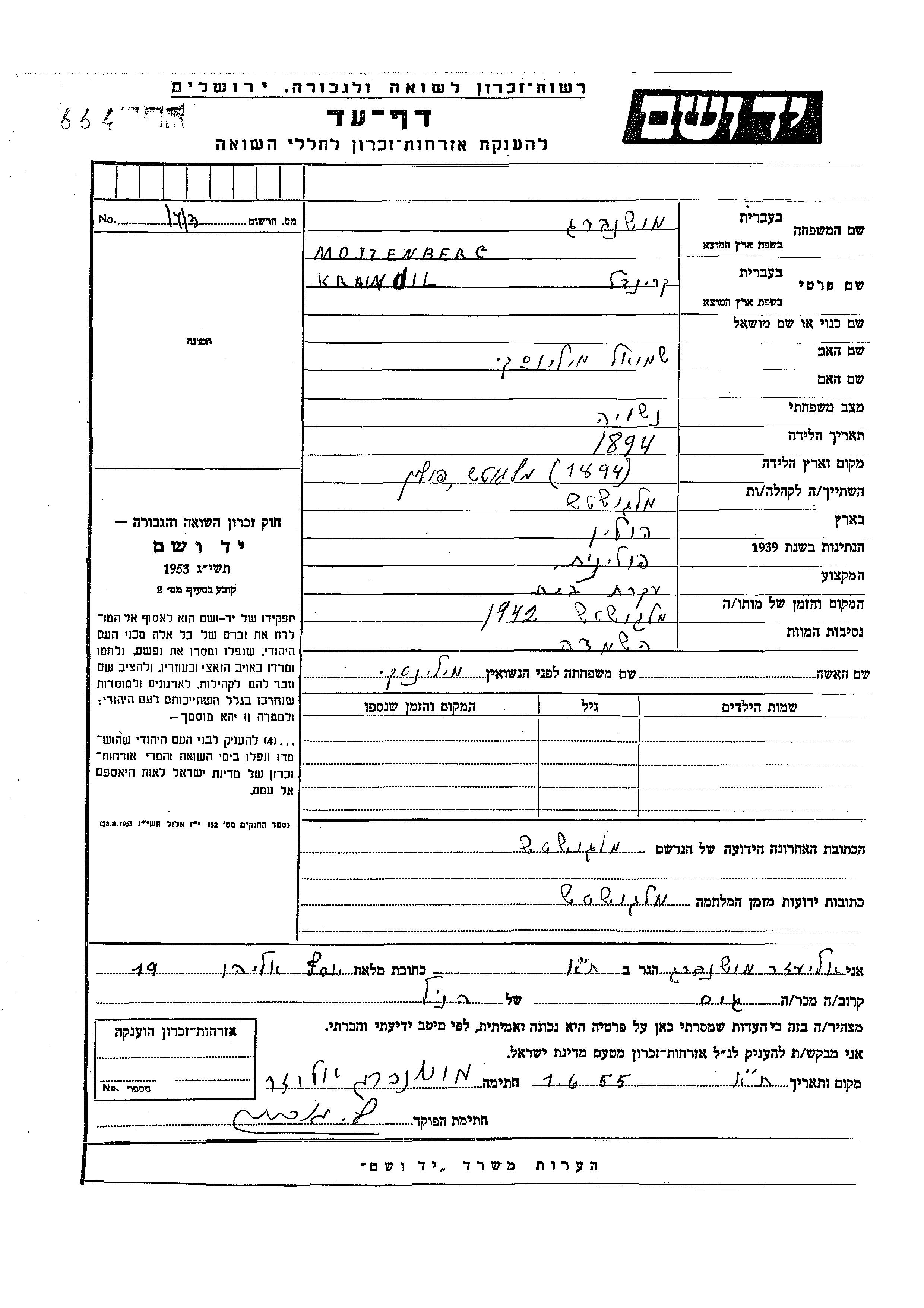 Крайндиль Мошенберг, девичья фамилия Милинский, место рождения: Малогощ, Польша. Отец: Шмуэль. Домохозяйка. Женат / замужем. Место жительства до войны: Малогощ, Польша. Место во время войны: Малогощ, Польша.