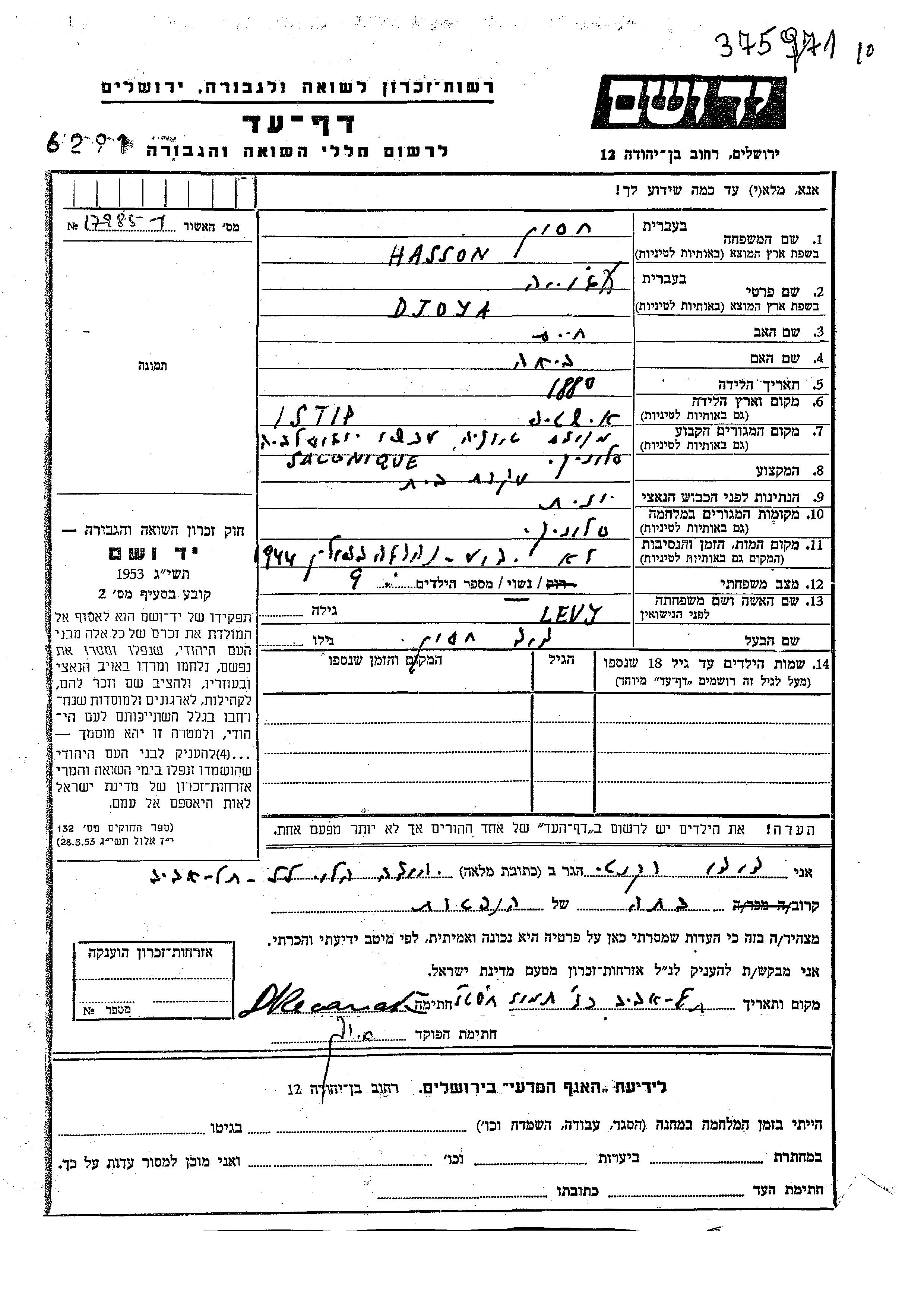 Джоя Хассон, девичья фамилия Леви, место рождения: Югославия. Отец: Хаим, mать:Бая. Домохозяйка. Женат / замужем. Место жительства до войны: Салоники, Греция. Место во время войны: Салоники, Греция.
