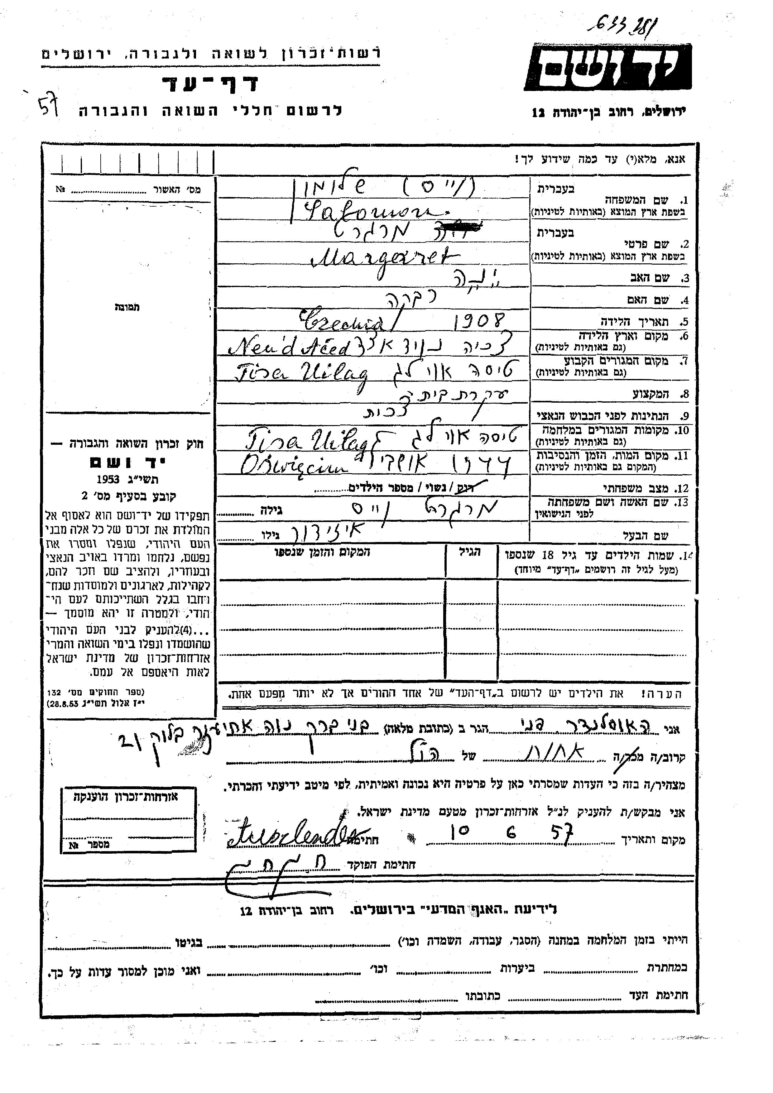 Маргарет Саломон, девичья фамилия Вейс, место рождения: Ачад, Венгрия. Отец: Яна, mать:Ривка. Домохозяйка. Женат / замужем. Место жительства до войны: Тисауйлак, Чехословакия.