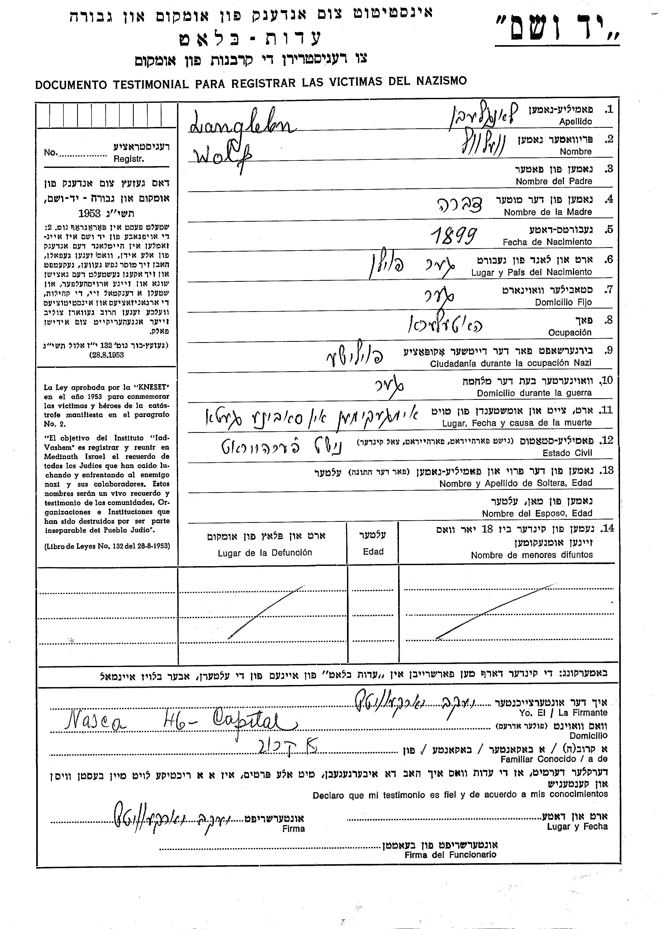 Вольф Ланглебен, место рождения: Гора-Кальвария, Польша.Mать:Двора. האטעלערא. Холост / не замужем. Место жительства до войны: Гора-Кальвария, Польша. Место во время войны: Гора-Кальвария, Польша.