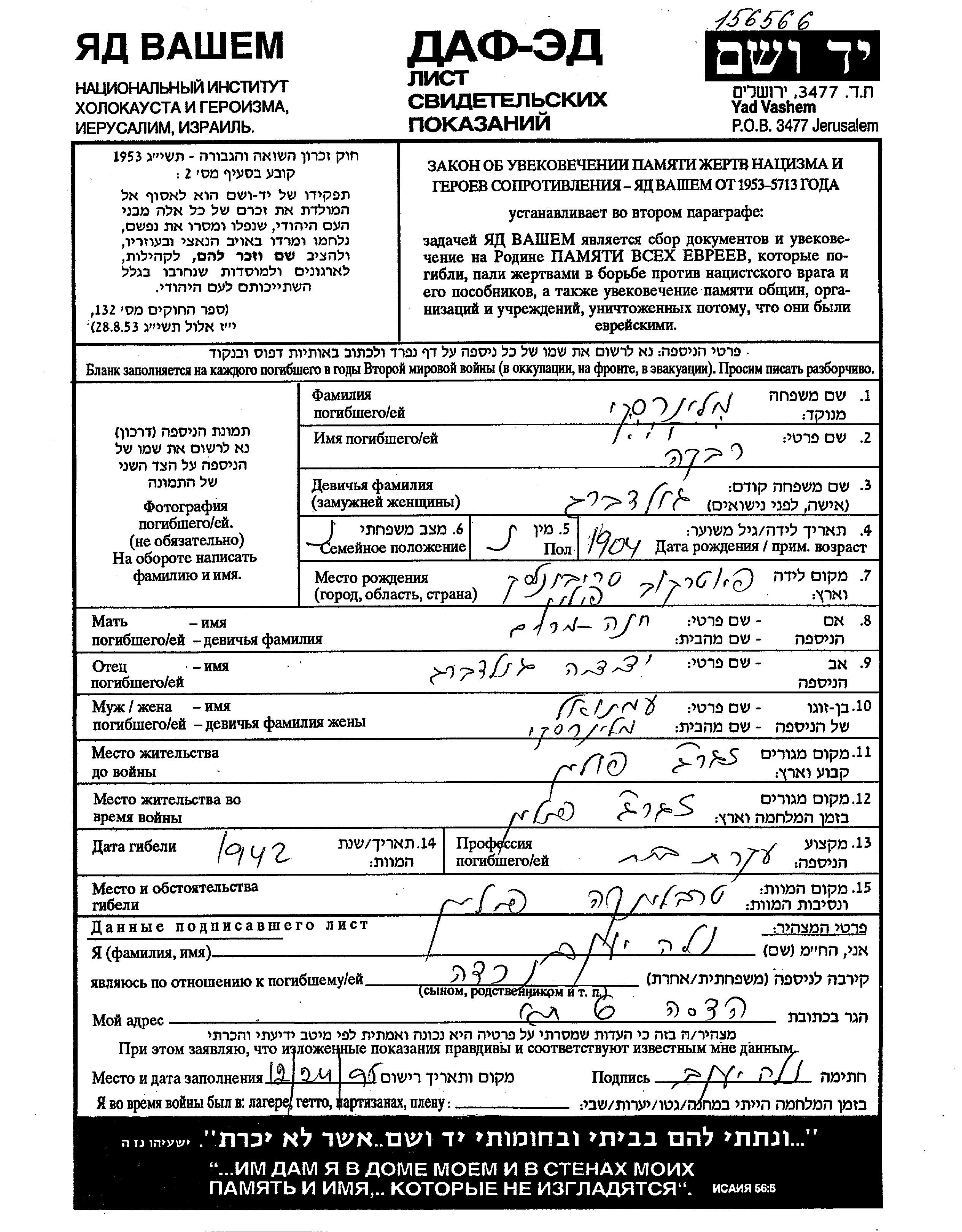 Яд Вашем - Листы свидетельских показаний Мемориального фонда
