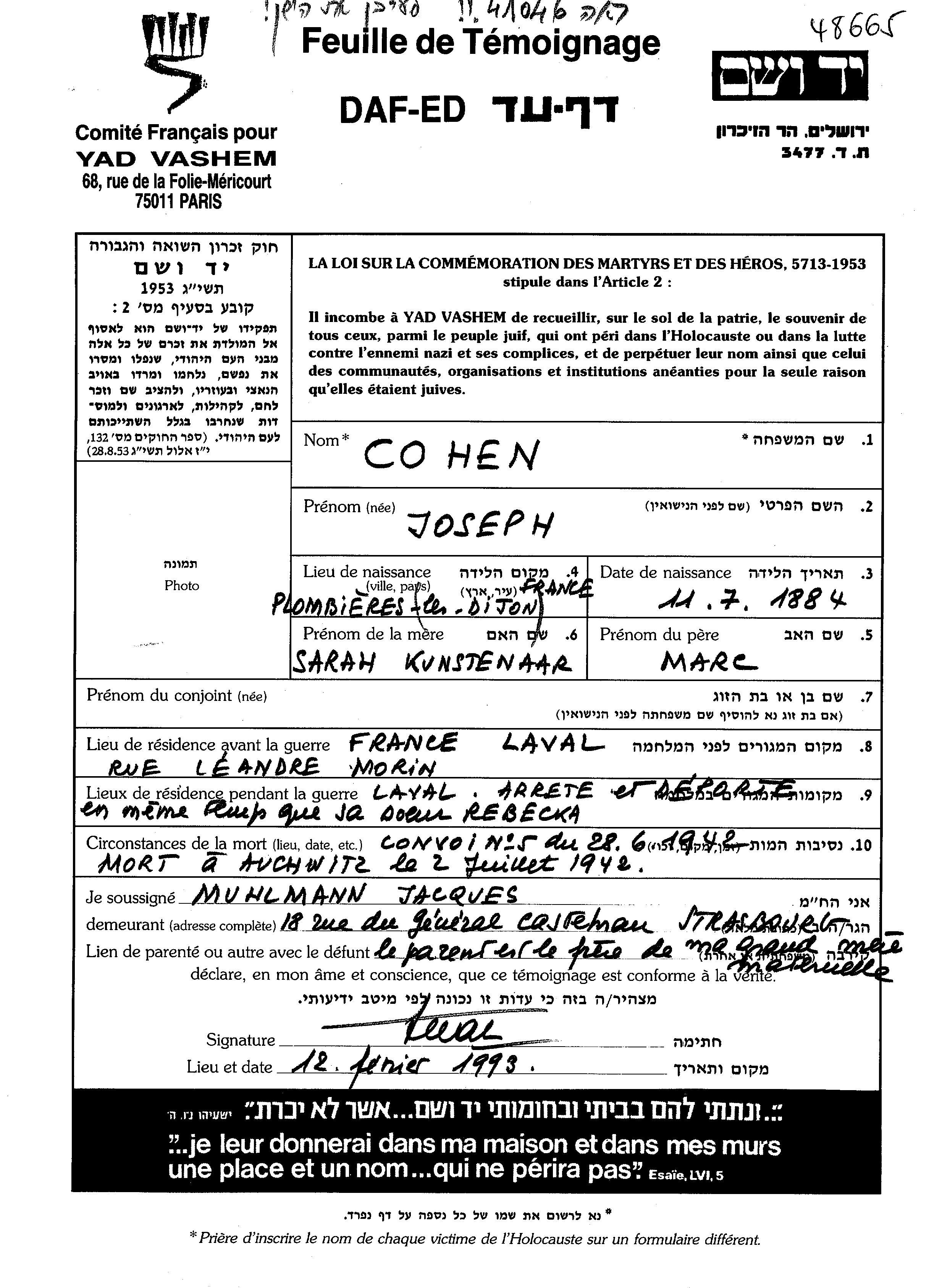 Коэн Йосеф 1884 Лаваль, Франция Лист свидетельских показаний