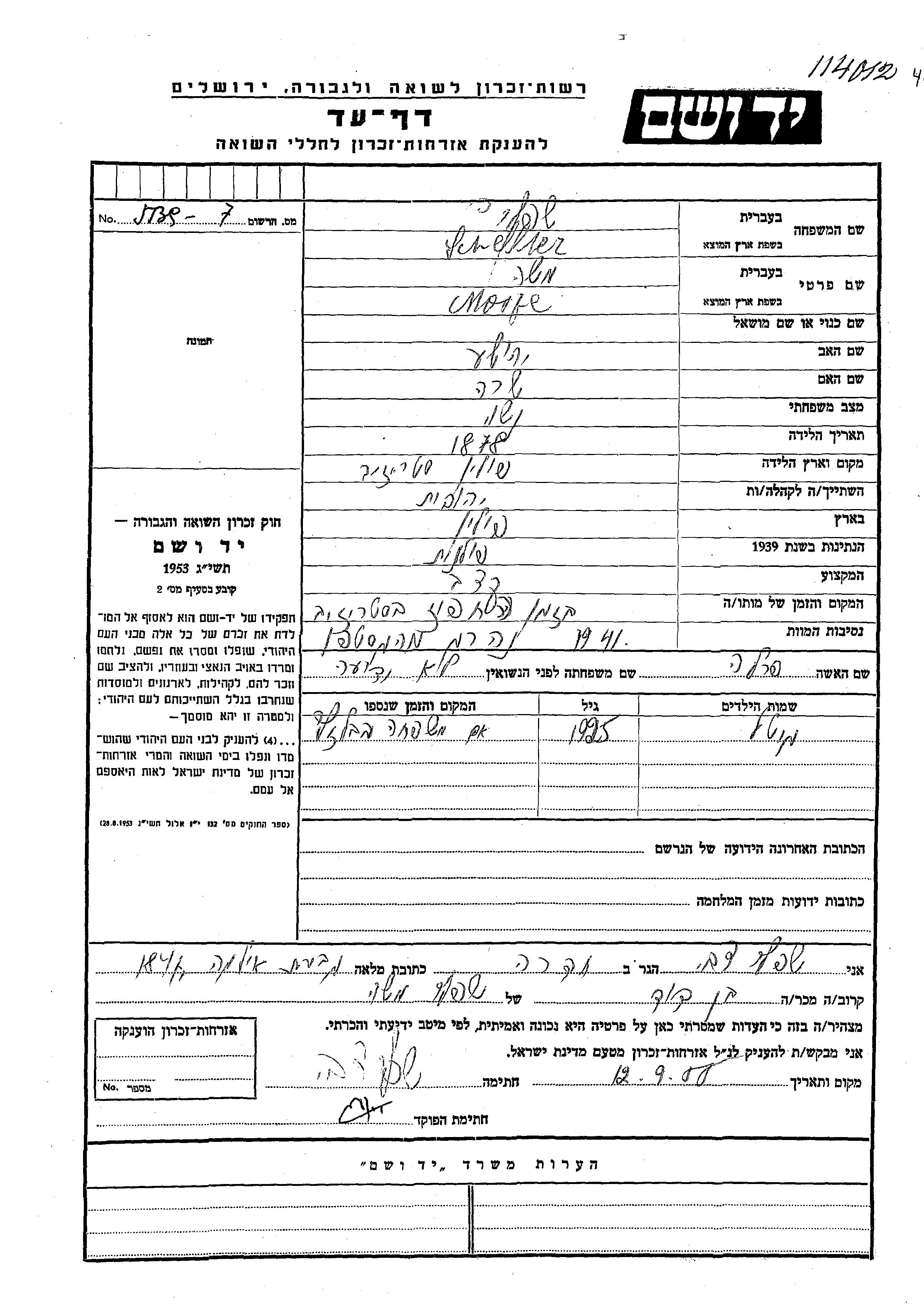 Яд Вашем - Листы свидетельских показаний Мемориального фонда