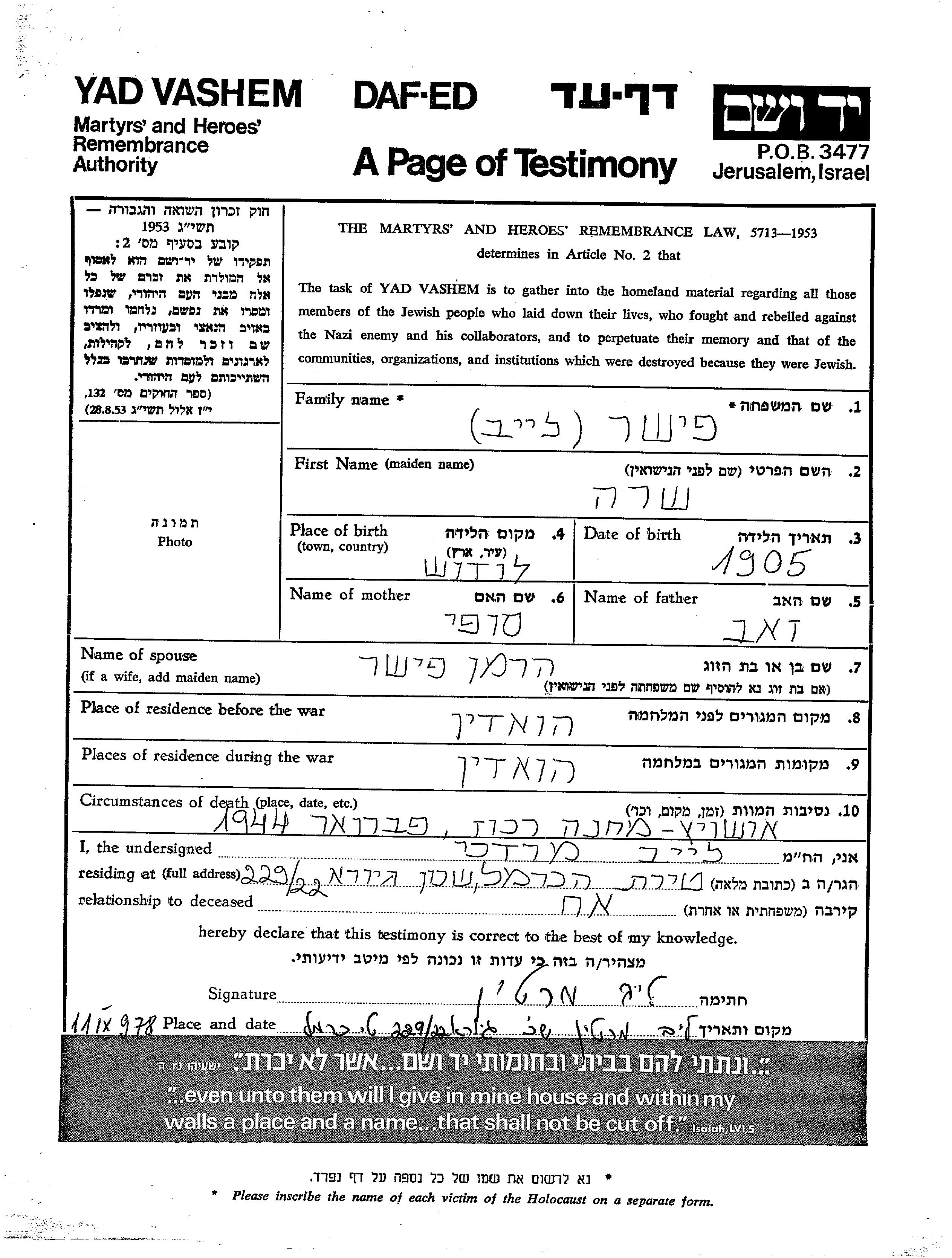 Сара Фишер, девичья фамилия Лейб, место рождения: Лудуш, Румыния. Отец: Зеев, mать:Софи. Женат / замужем. Место жительства до войны: Хуедин, Румыния. Место во время войны: Хуедин, Румыния.