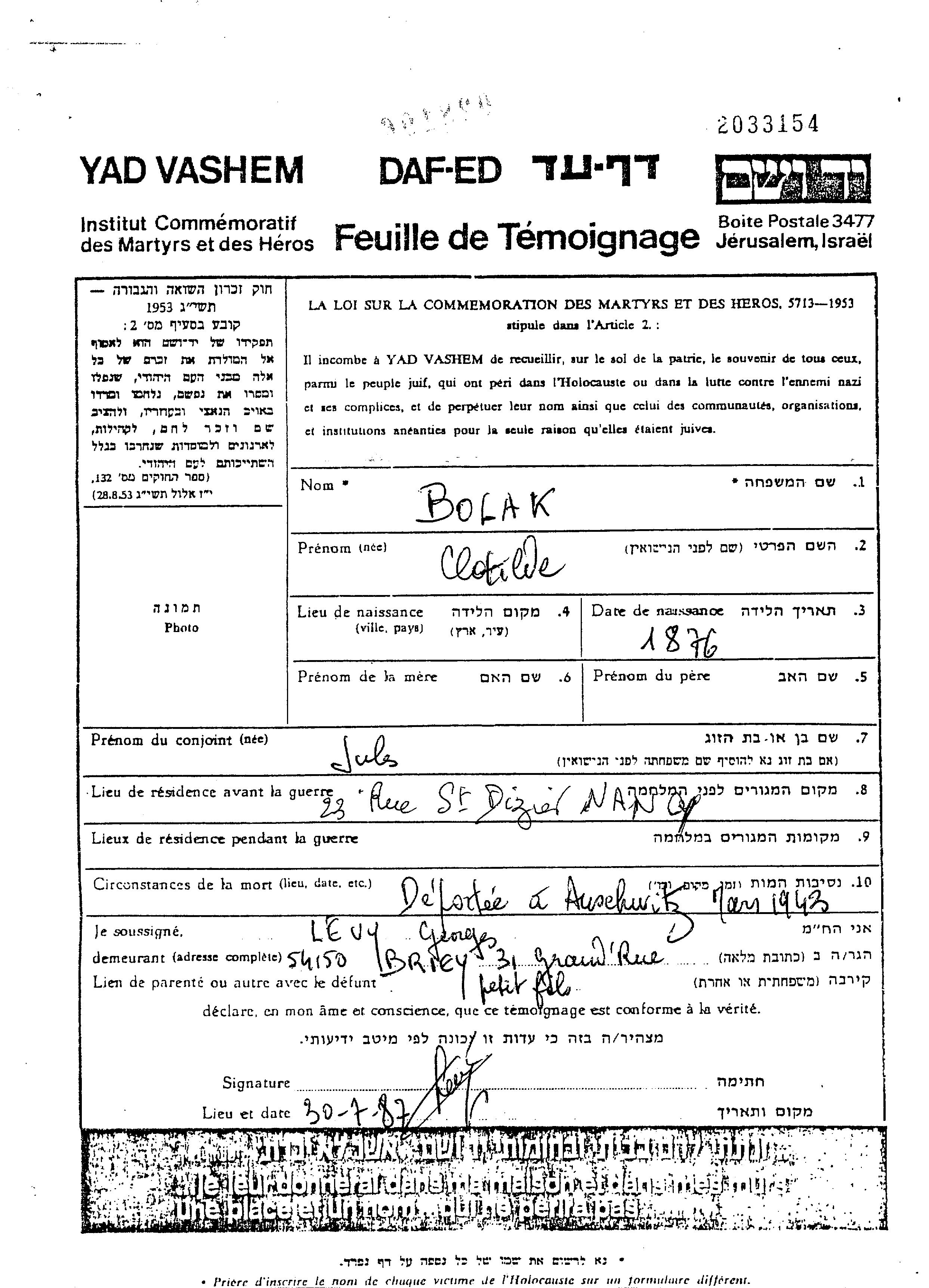 Клотильде Болак. Место жительства до войны: Нанси, Франция.