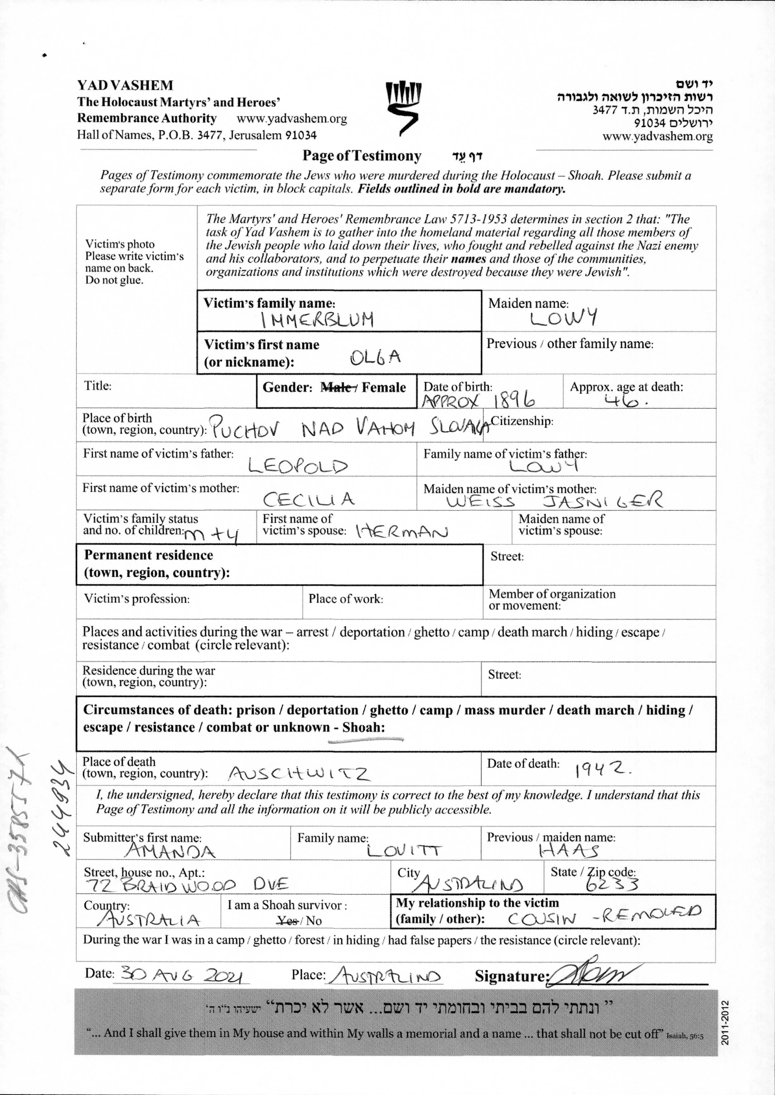 Ольга Иммерблюм, девичья фамилия Лёви, место рождения: Пухов Над Вагом, Чехословакия.