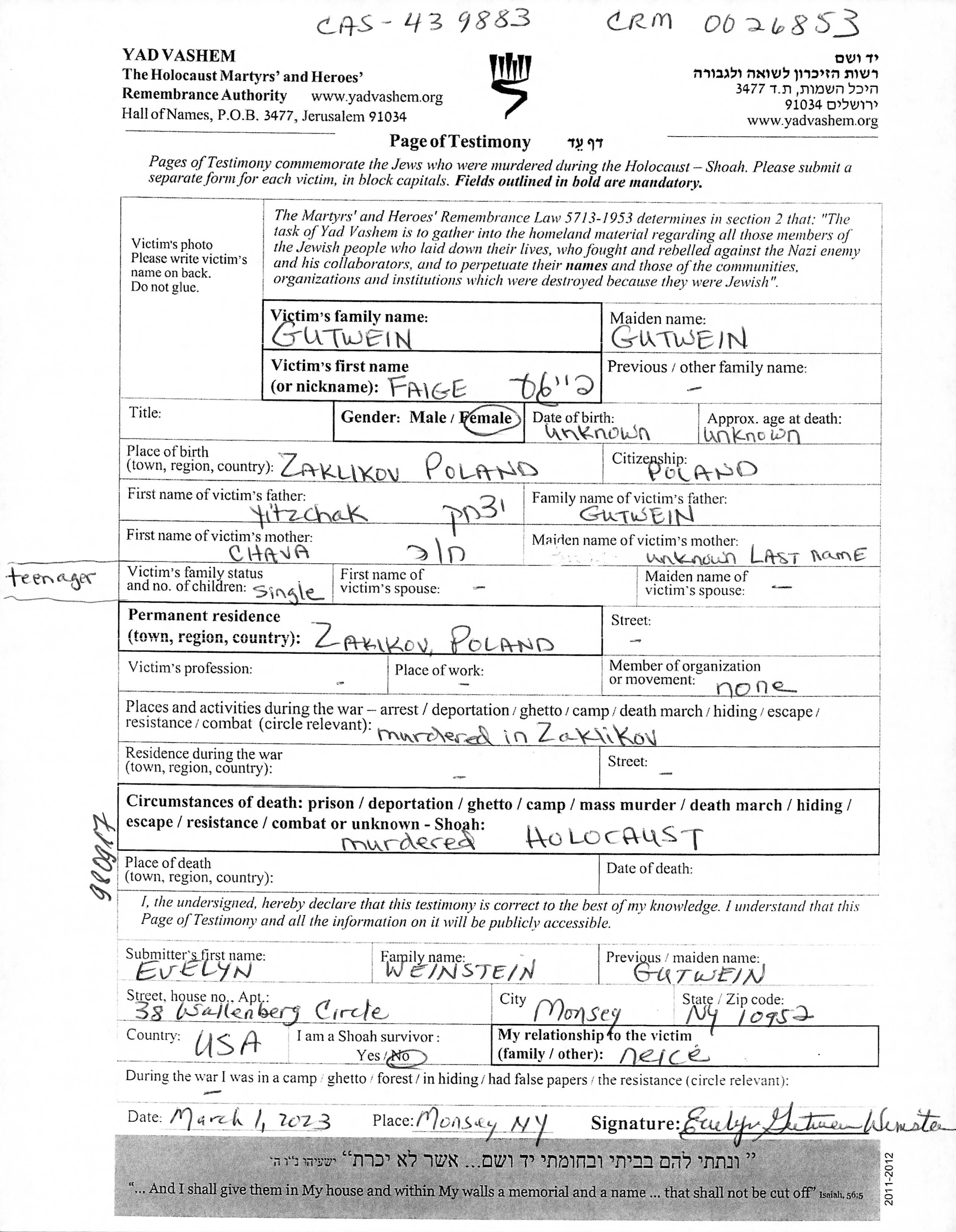 Файге Гутвейн, место рождения: Закликув, Польша. Отец: Ицхак, mать:Хава. Ребенок. Место жительства до войны: Закликув, Польша. Место во время войны: Закликув, Польша.