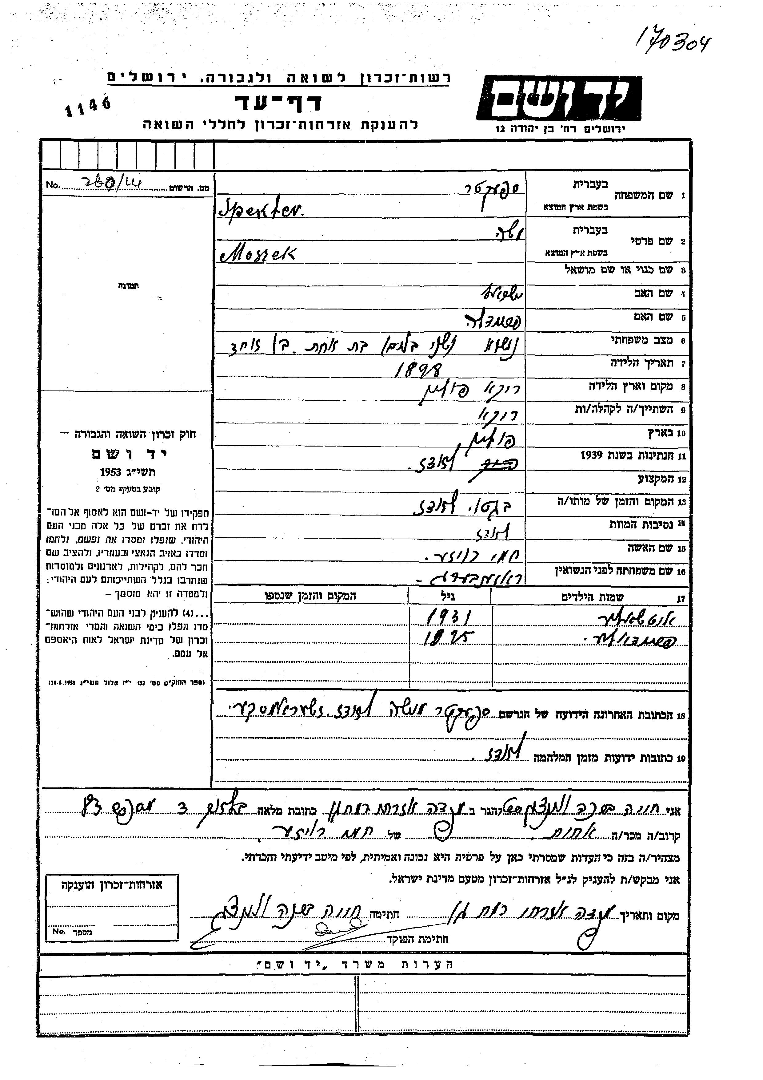 Мошек Спектер, место рождения: Рика, Польша. Отец: Исраэль, mать:Фрайдла. Женат / замужем. Место жительства до войны: Рика, Польша. Место во время войны: Лодзь, Польша.