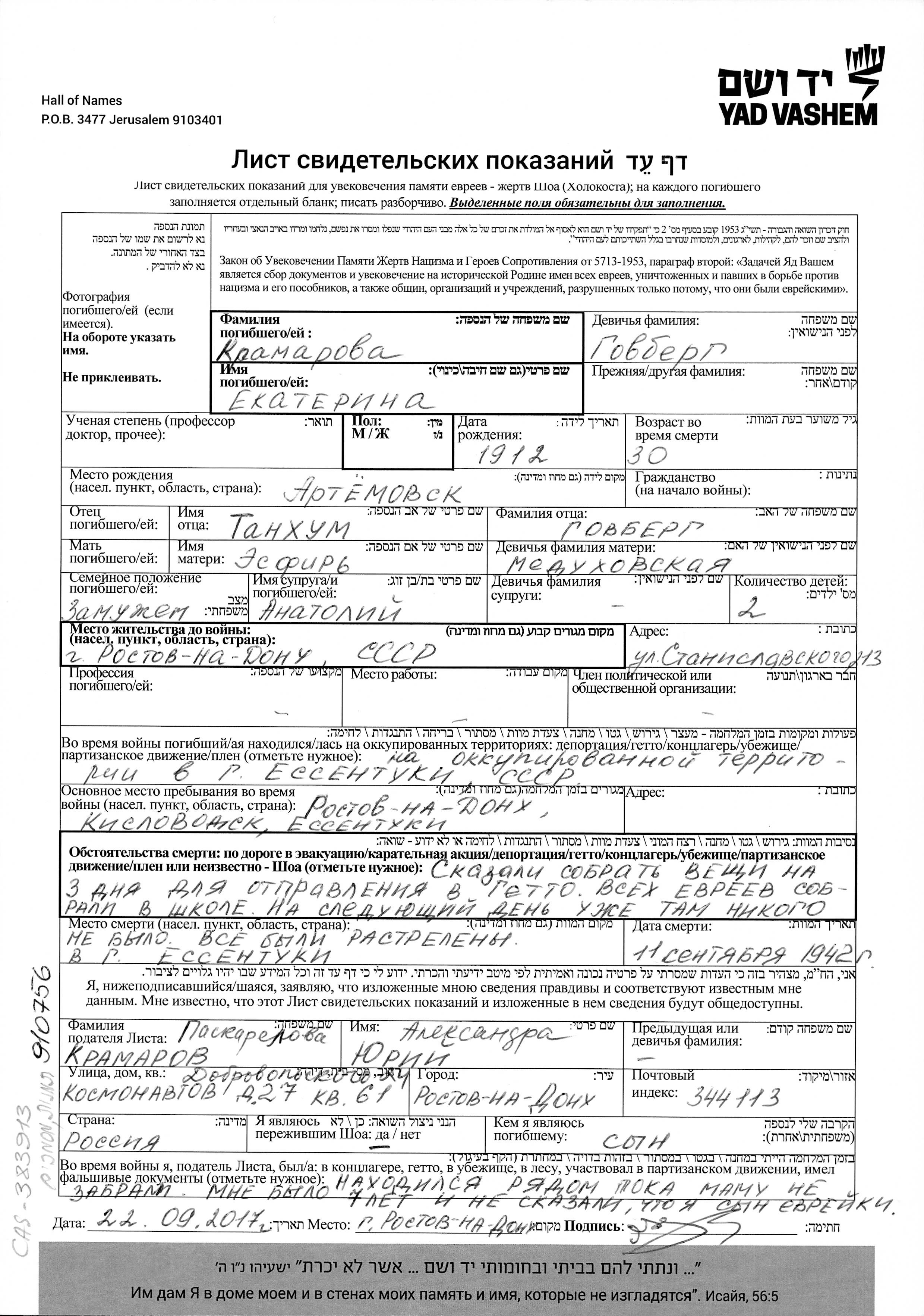 Крамарова Екатерина 1915 Ростов на Дону, Россия (СССР) Лист свидетельских показаний