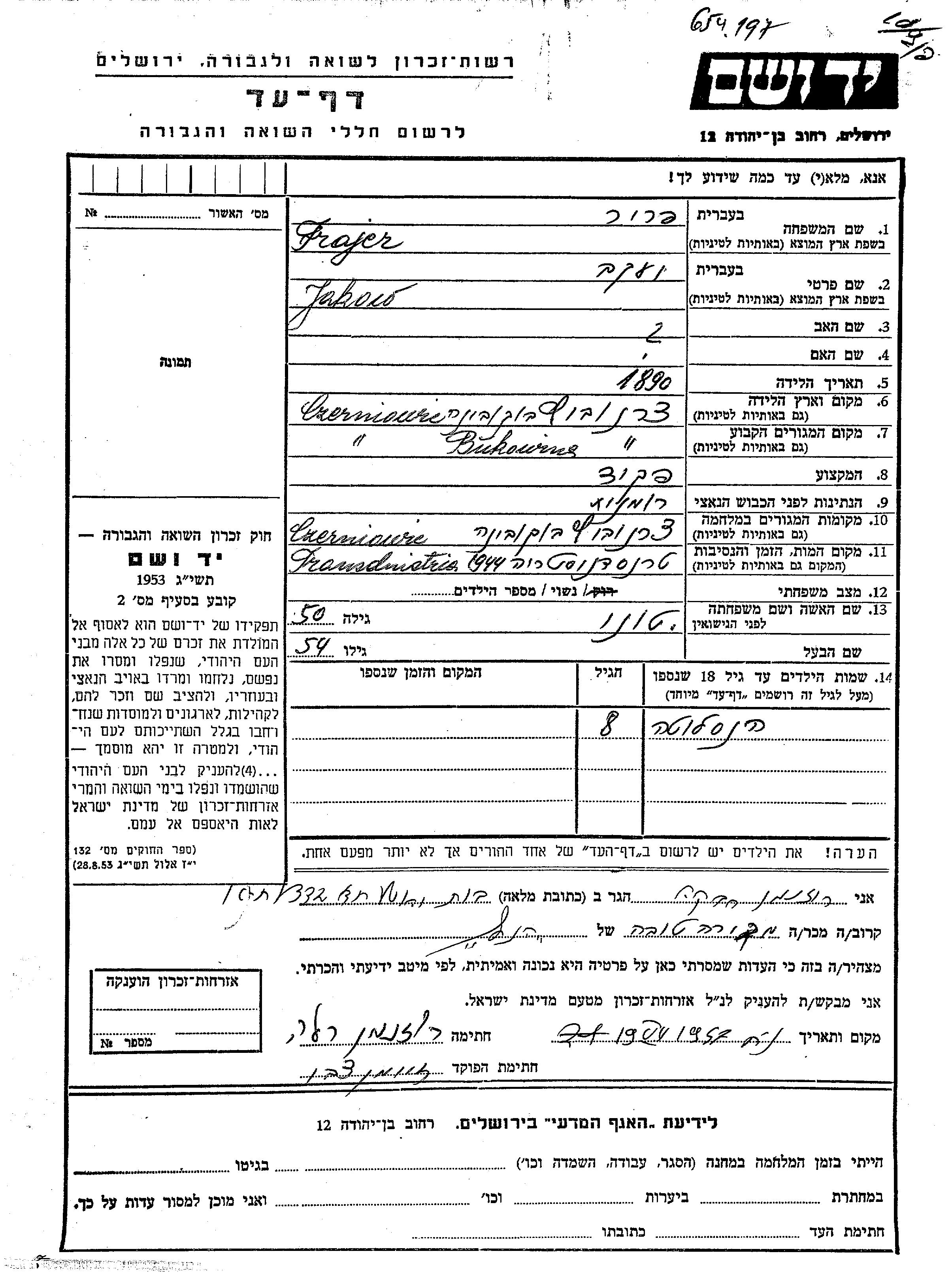Яков Фрайер, место рождения: Черновцы, Румыния. Клерк. Женат / замужем. Место жительства до войны: Черновцы, Румыния. Место во время войны: Черновцы, Румыния.