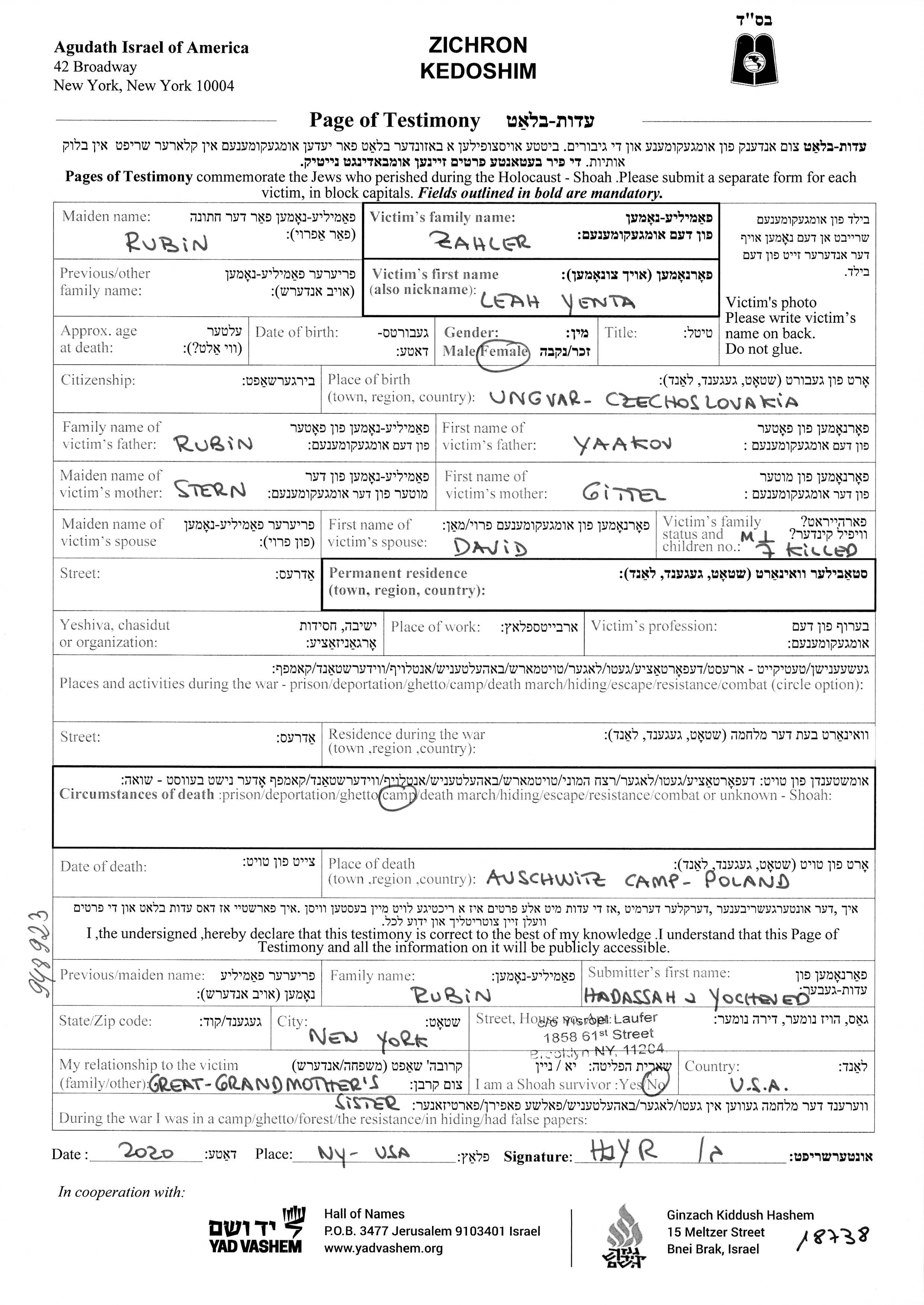 Цалер | Лея | 1905 | Унгвар, Чехословакия | Лист свидетельских показаний |