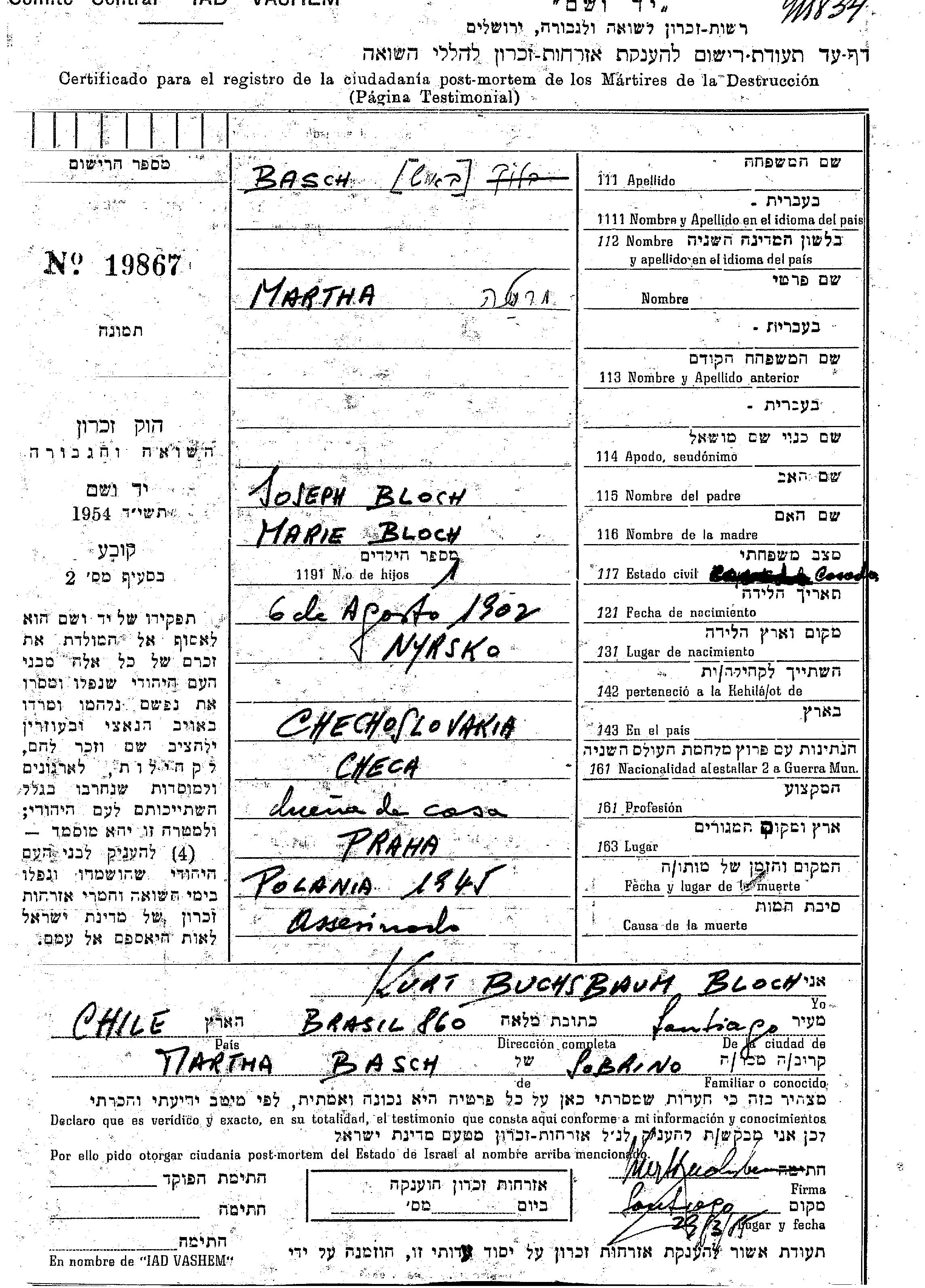 Марта Баш, девичья фамилия Блох, место рождения: Нирско, Чехословакия. Отец: Иосеф, mать:Мари. Женат / замужем. Место жительства до войны: Прага, Чехословакия.
