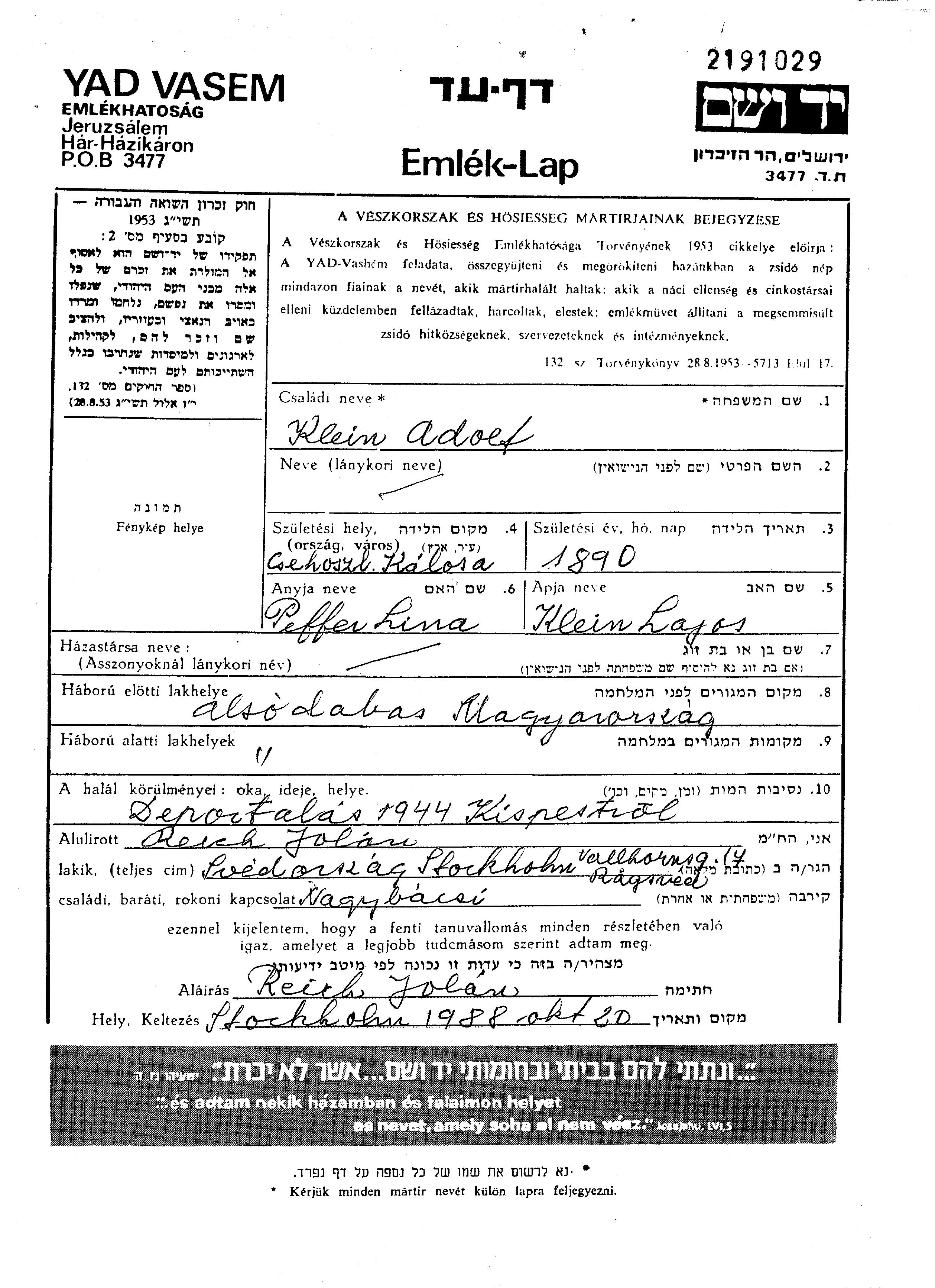 | Клейн | Адольф | 1890 | Альшодабаш, Венгрия | Лист свидетельских показаний |