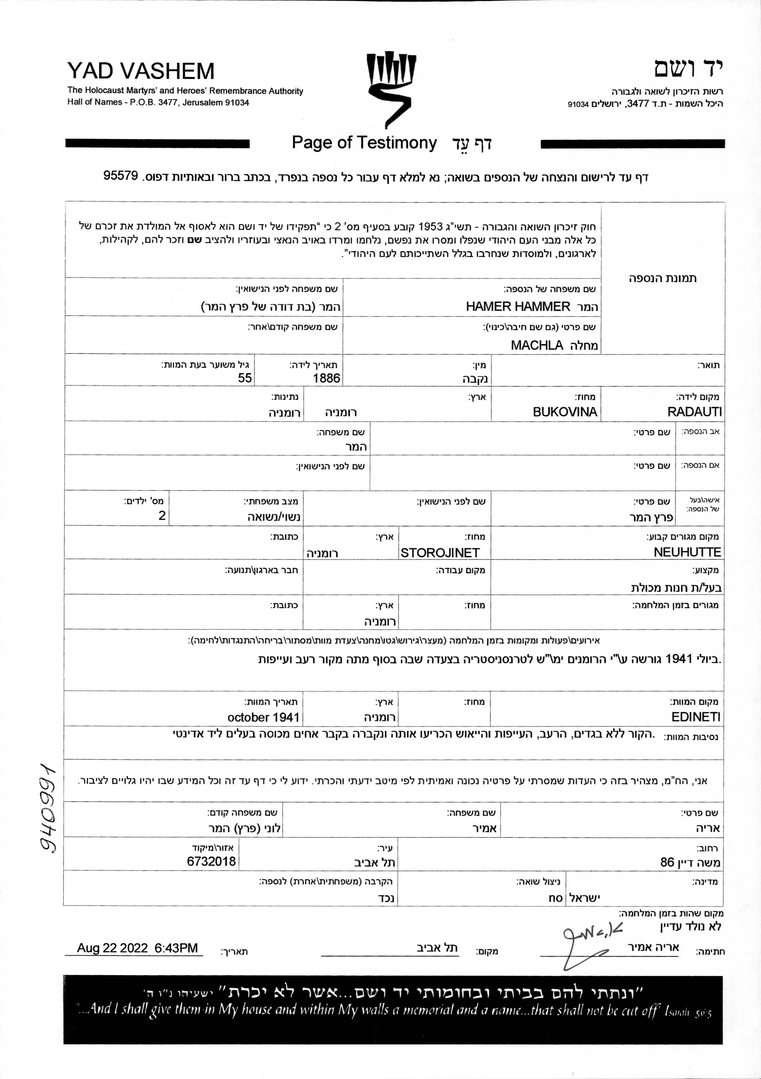 Махла Хаммер, девичья фамилия Хамер, место рождения: Рэдэуци, Румыния. Владелец / владелица продуктового магазина. Место жительства до войны: Краснишоара Ноуа, Румыния.