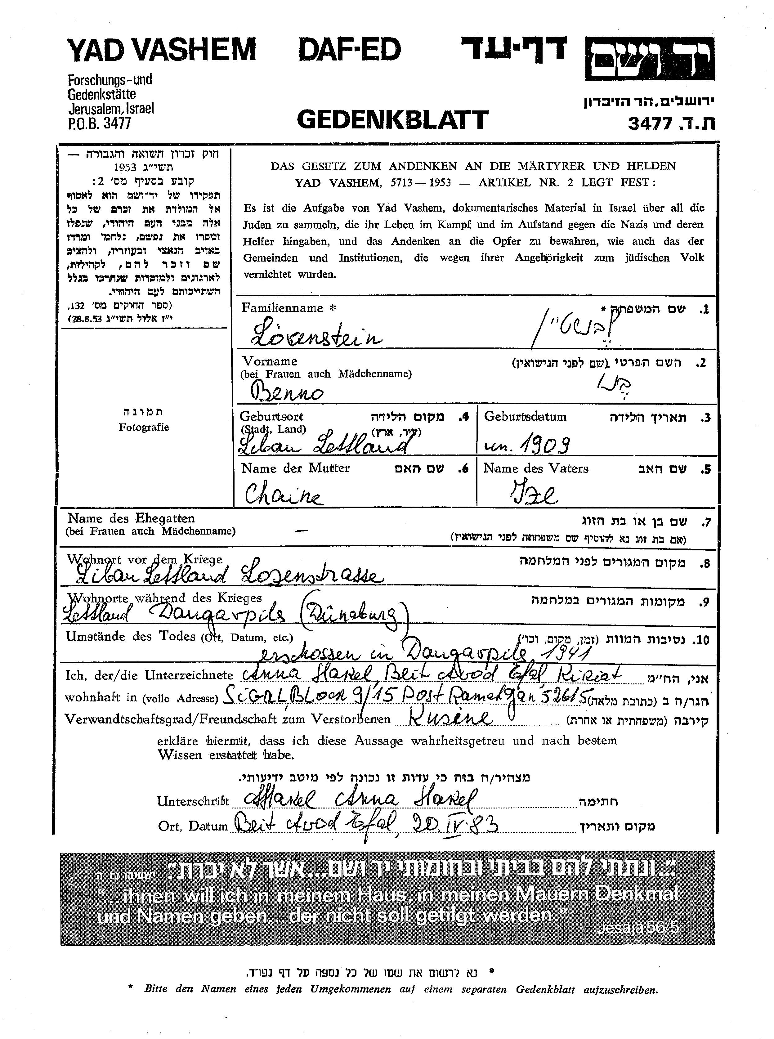 Бенно Бено Лёвенштейн Лебенштайн, место рождения: Либау, Латвия. Отец: Ицл, mать:Хайне. Место жительства до войны: Либау, Латвия.