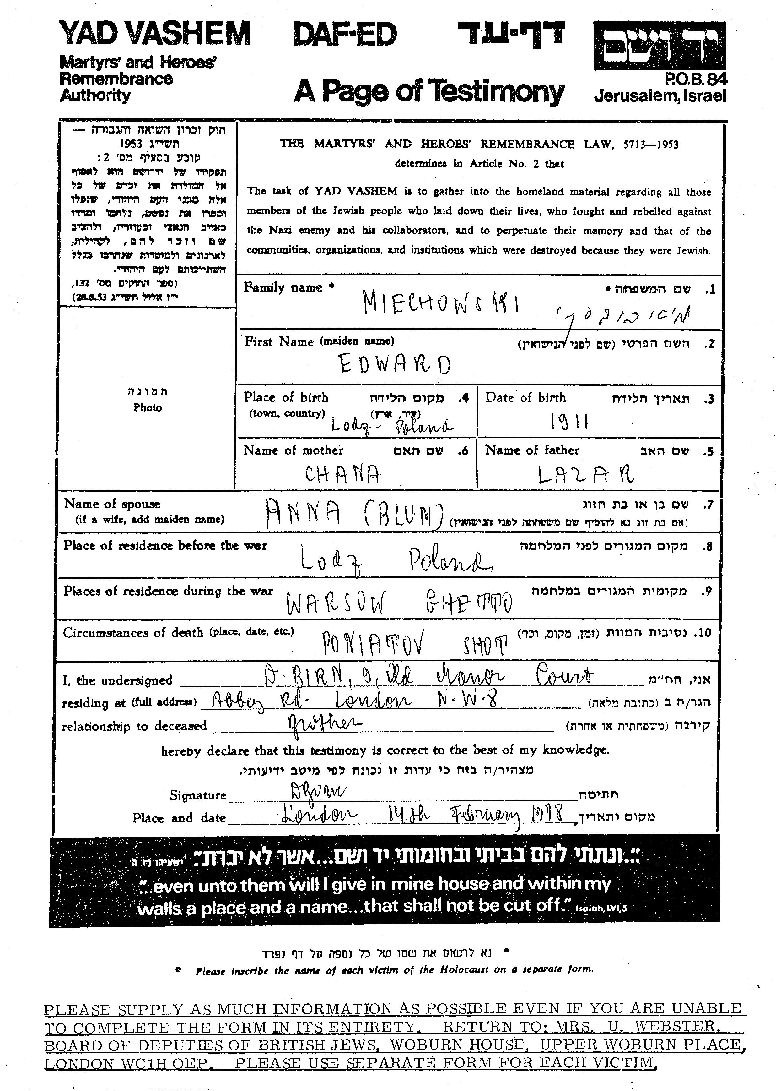 Эдвард Меховски, место рождения: Лодзь, Польша. Отец: Лазарь, mать:Хана. Женат / замужем. Место жительства до войны: Лодзь, Польша. Место во время войны: Варшава, Польша.