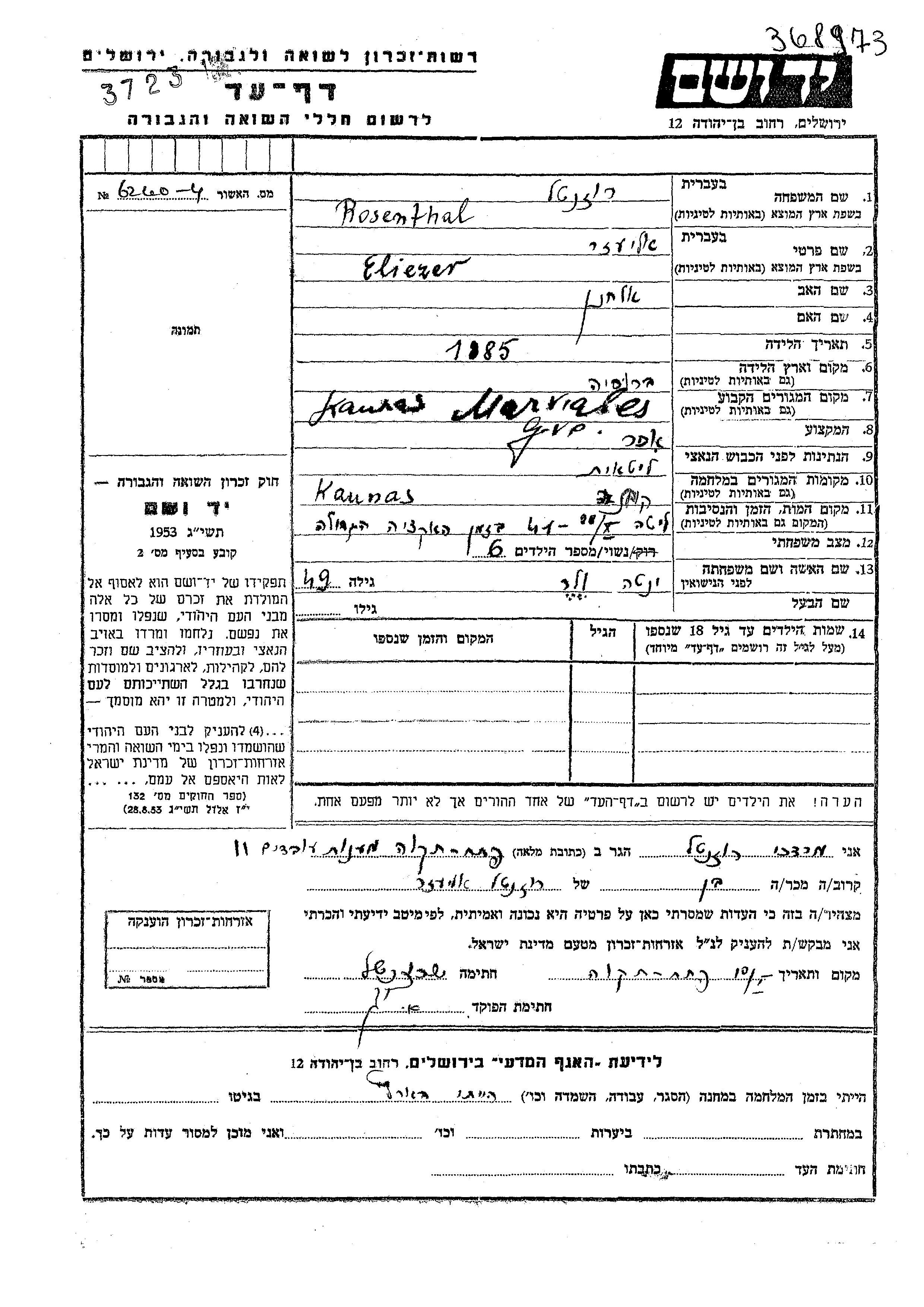Элиэзер Розенталь, место рождения: место не указано. Владелец / владелица фермы. Место жительства до войны: Ковно, Литва.