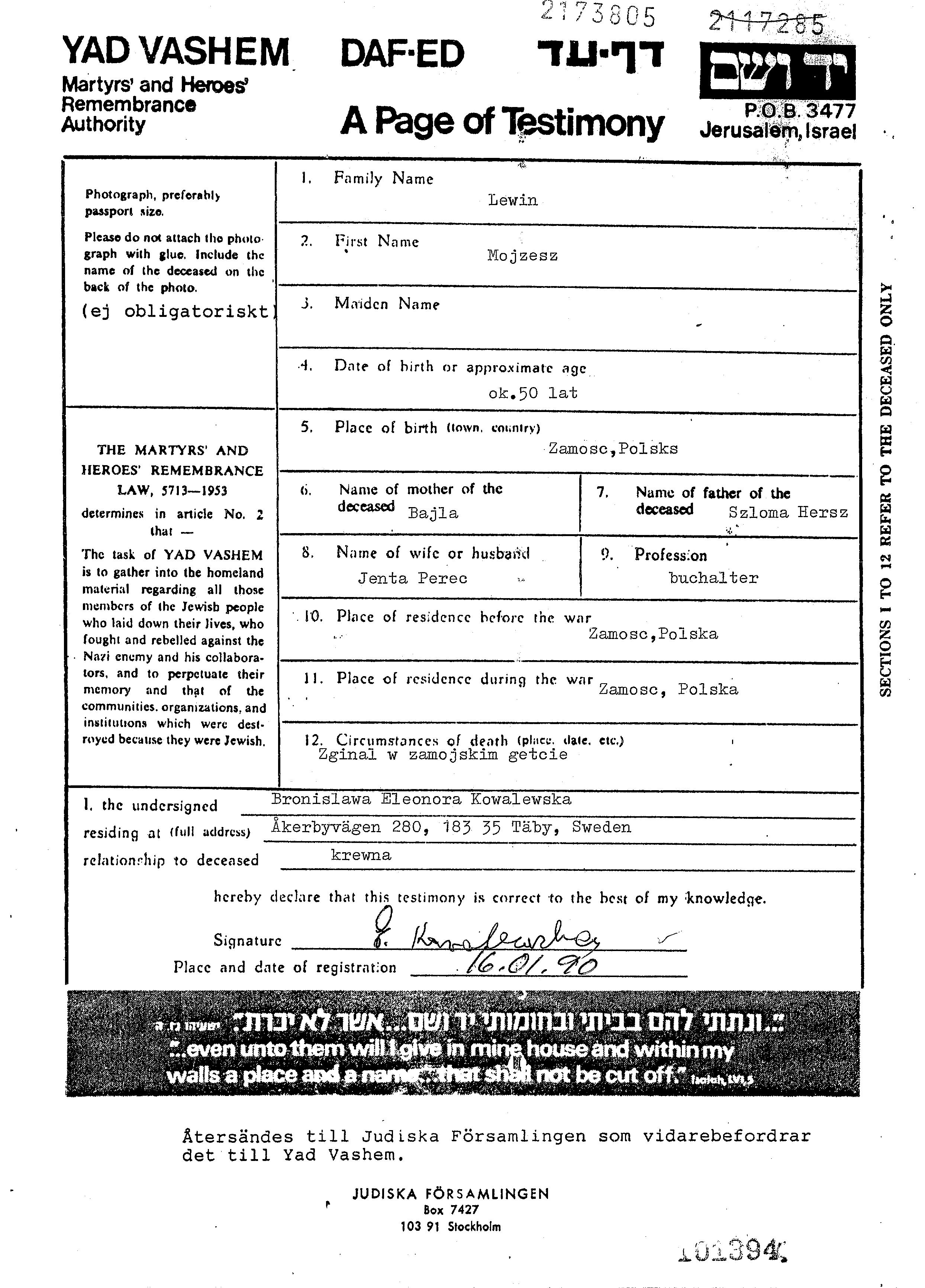 Мошко Левин, место рождения: Замосць, Польша. Бухгалтер / счетовод. Место жительства до войны: Замосць, Польша.