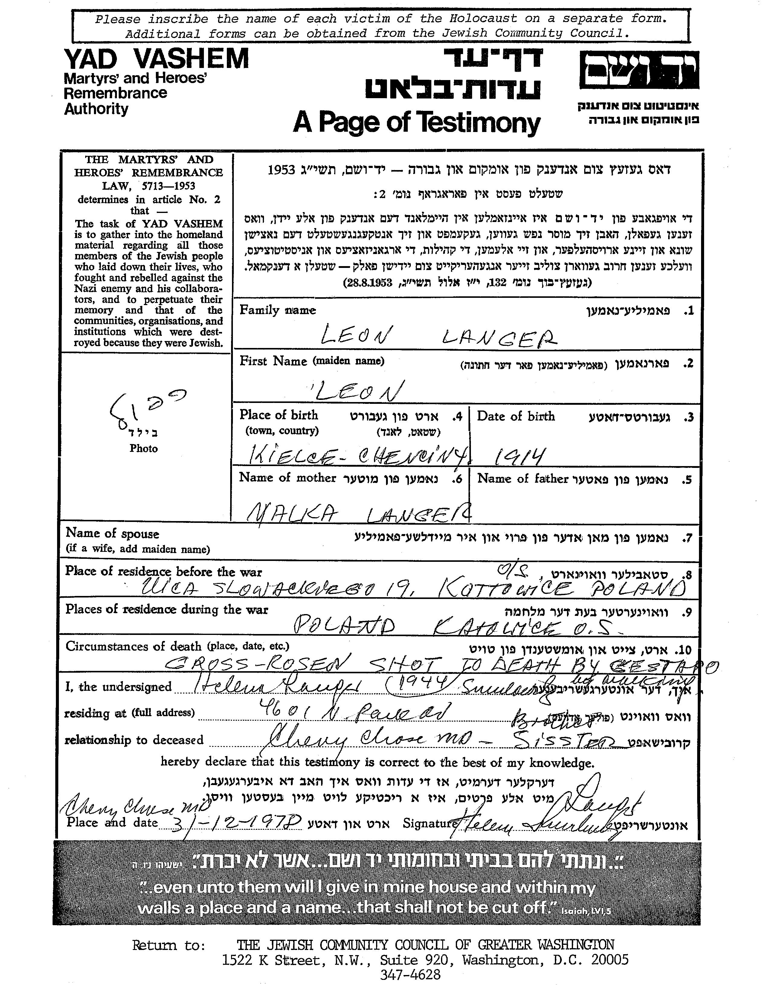 Леон Лангер, место рождения: Хенцины, Польша.Mать:Малка. Место жительства до войны: Катовице, Польша. Место во время войны: Катовице, Польша.