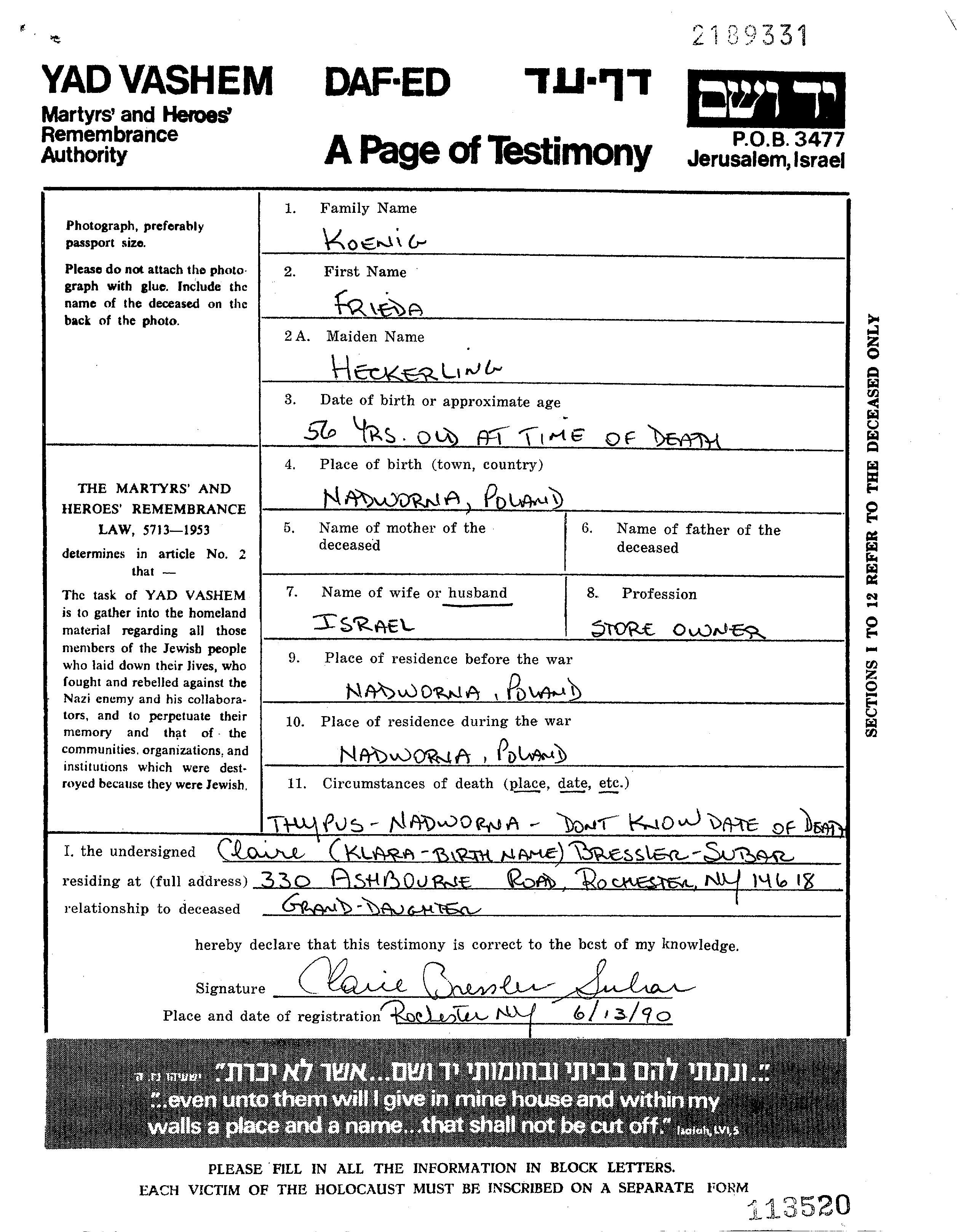 Кёниг | Фрида | Надворная, Польша | Лист свидетельских показаний | |