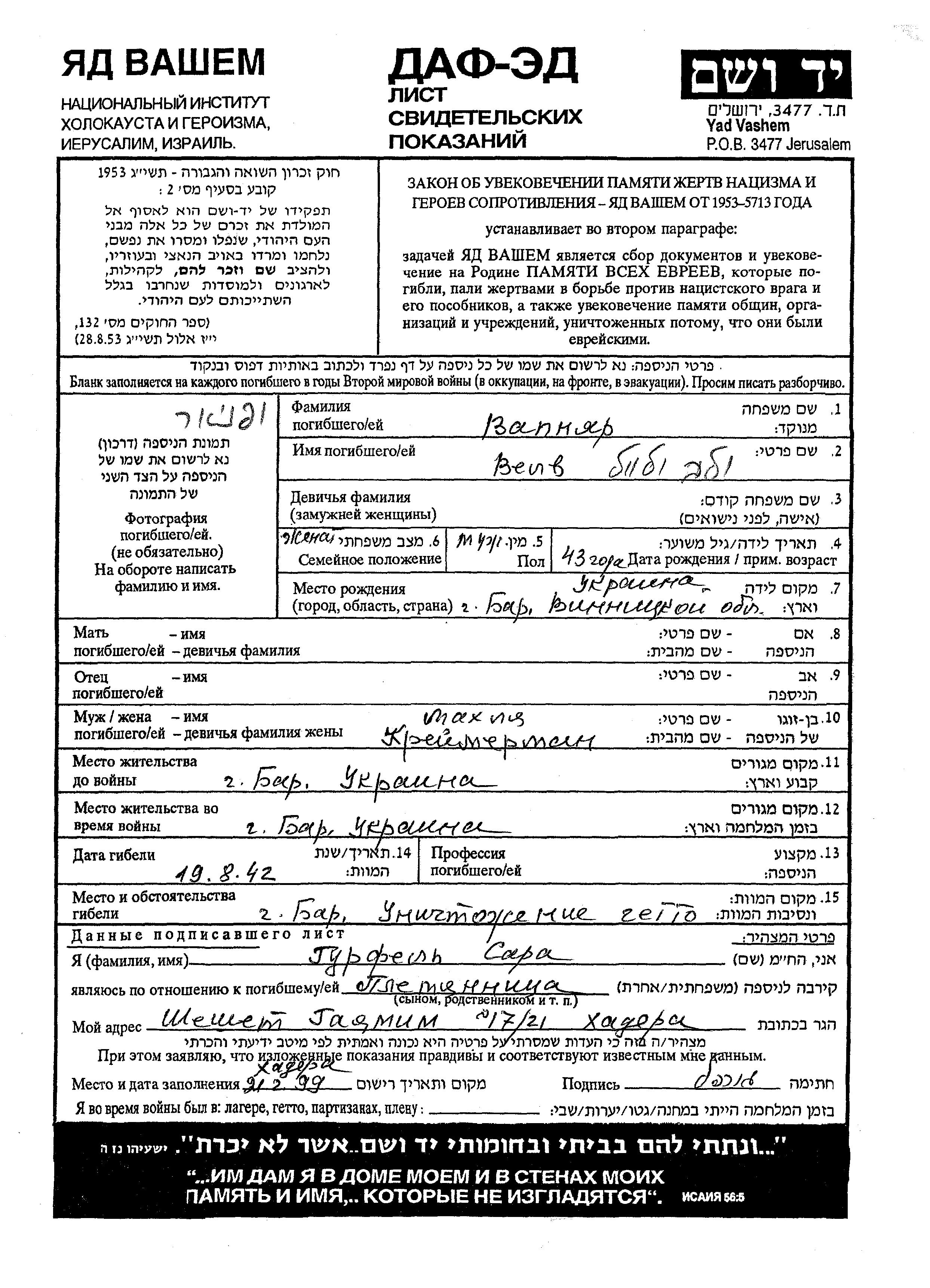 Вапняр Велв Бар, Украина (СССР) Лист свидетельских показаний